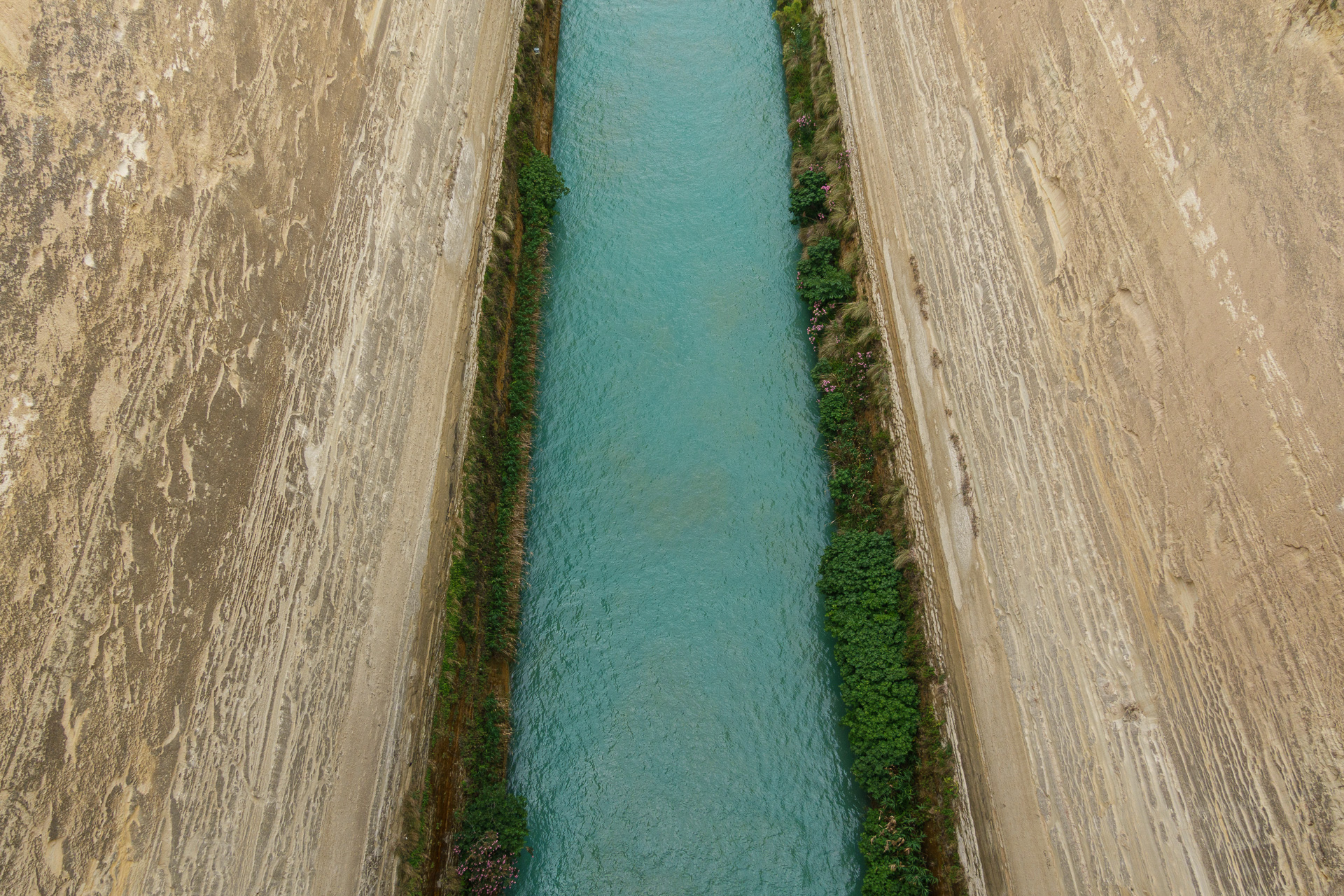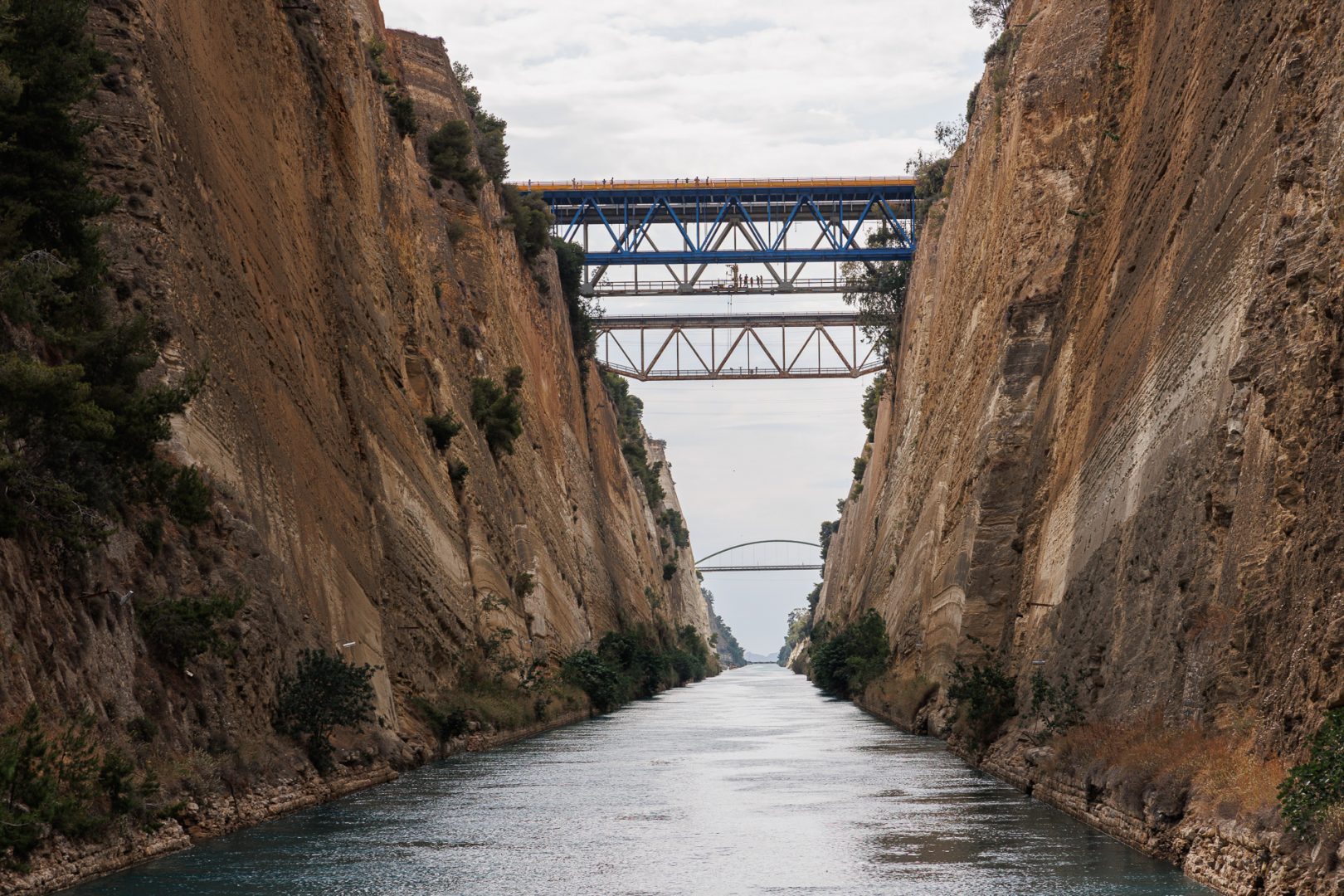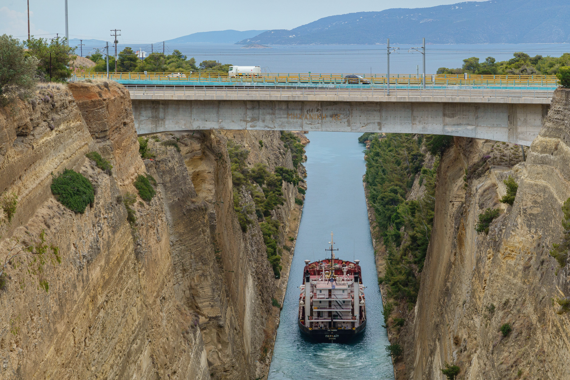 En quittant notre bivouac ce matin, nous avons l’opportunité de nous arrêter sur un parking qui va nous permettre de voir le canal de Corinthe sous un autre angle.