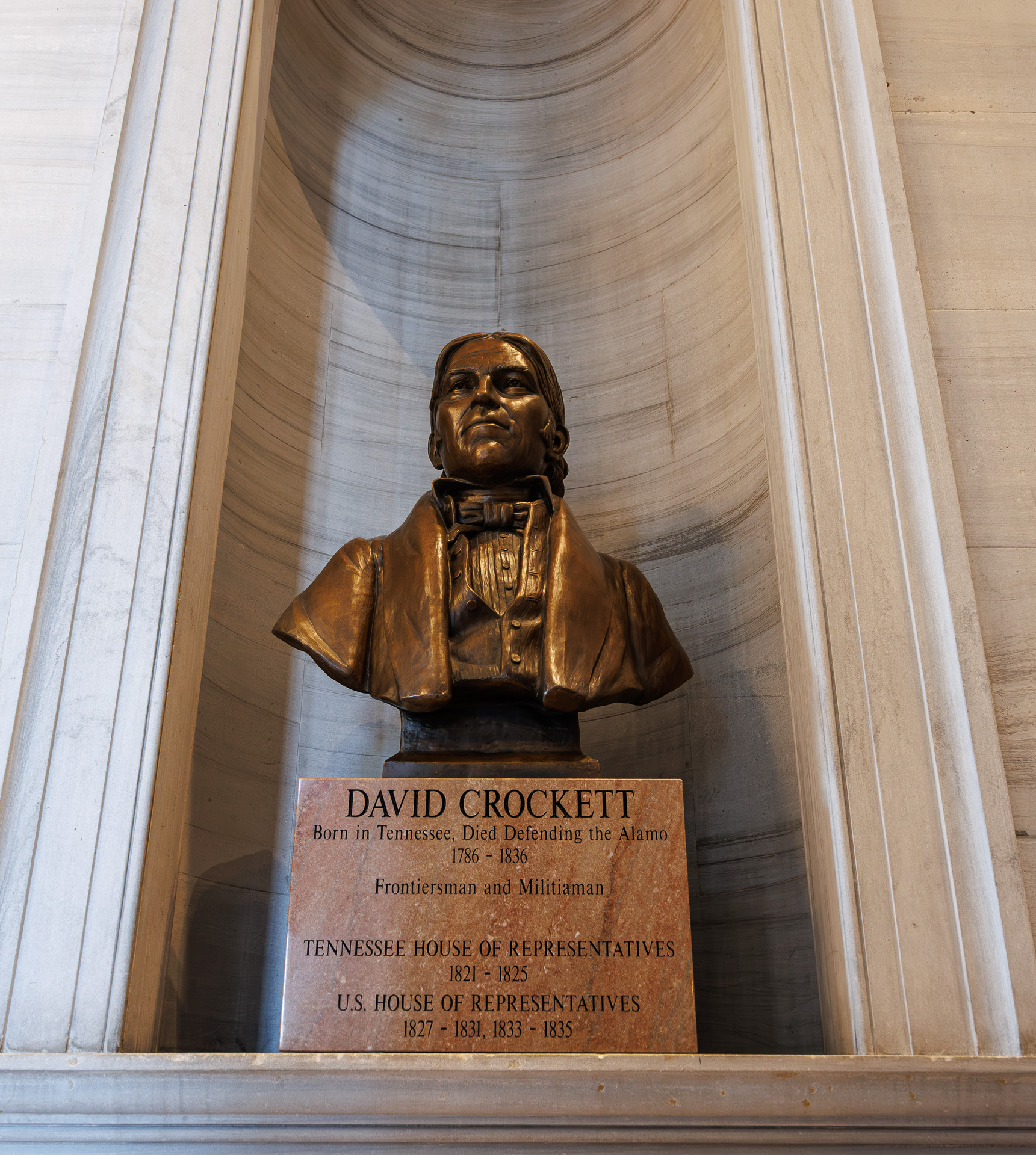 David Crockett, dit Davy Crockett (1786-1836 à la bataille de Fort Alamo) a été élu pendant plusieurs années comme représentant de l’État du Tennesee. Il est devenu un héros populaire de l’histoire des États-Unis et des séries télévisées de notre enfance 😜 !