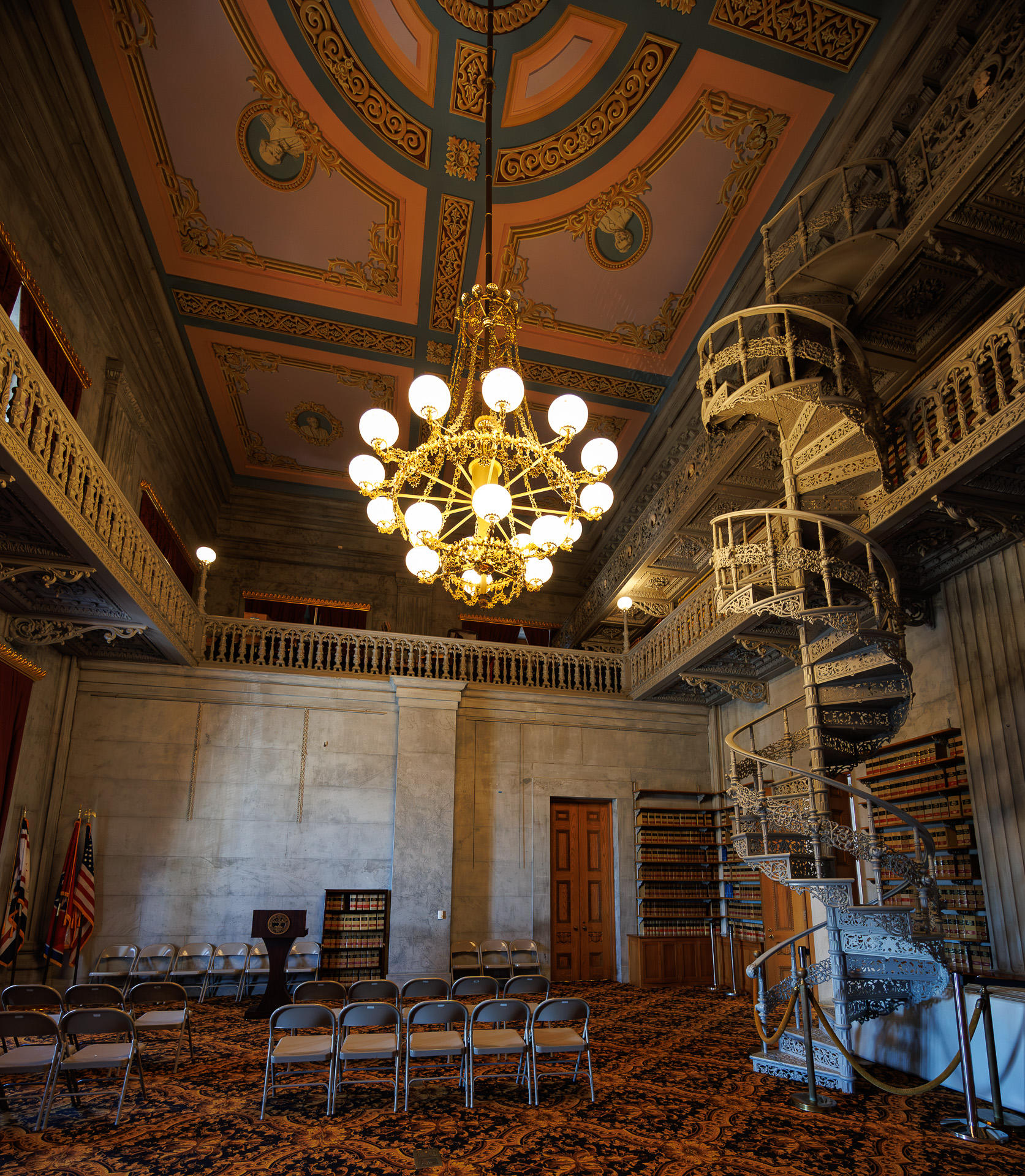 L’ancienne bibliothèque du 19ème siècle avec son bel escalier en spirale et son plafond des portraits