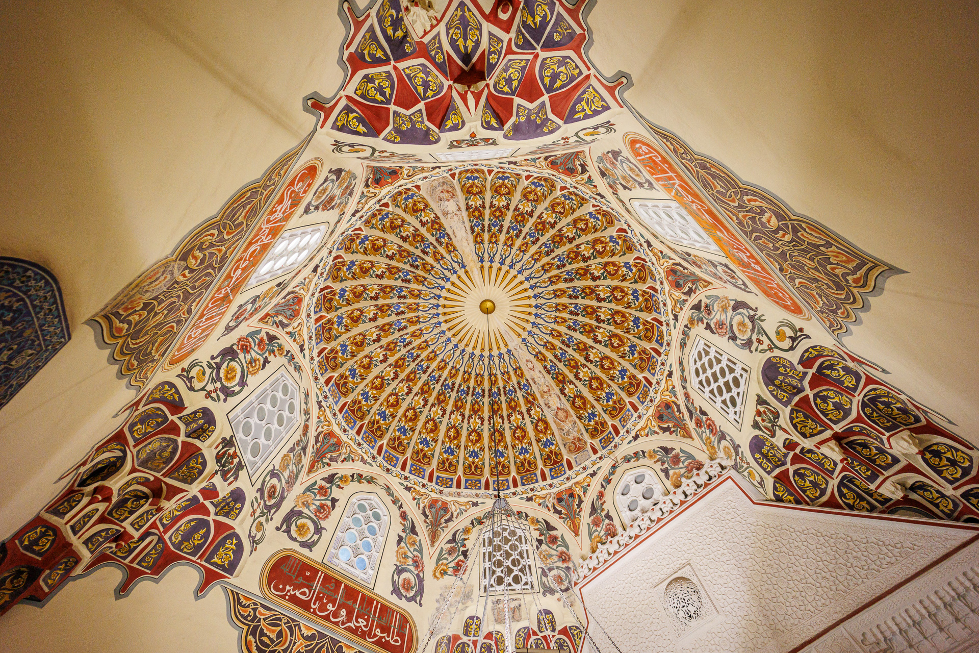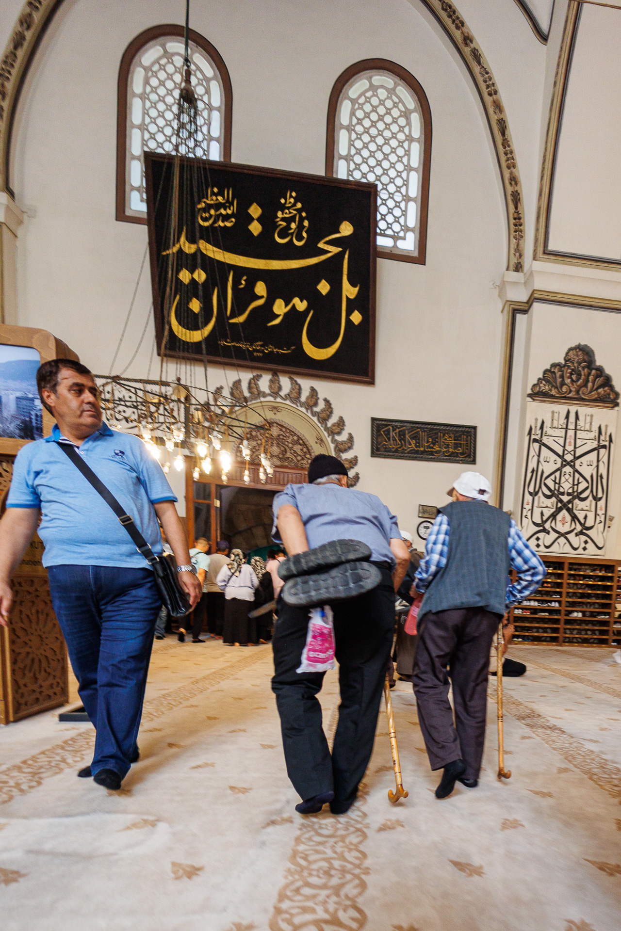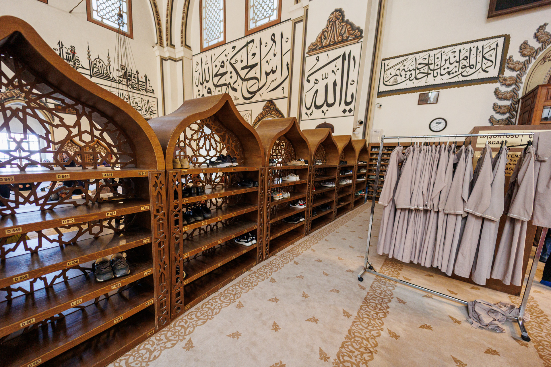 L’intérieur est spacieux et légèrement éclairé, afin de créer un sentiment de paix et de contemplation. Les subdivisions formées par les nombreux dômes génèrent une intimité propice à la spiritualité, qui cohabite sans problème avec les enfants qui jouent sur la moquette, les discussions des uns et des autres, les déplacements permanents des fidèles et des touristes,… C’est très différent de ce que nous connaissons dans les églises chrétiennes et cela donne une ambiance assez agréable.
