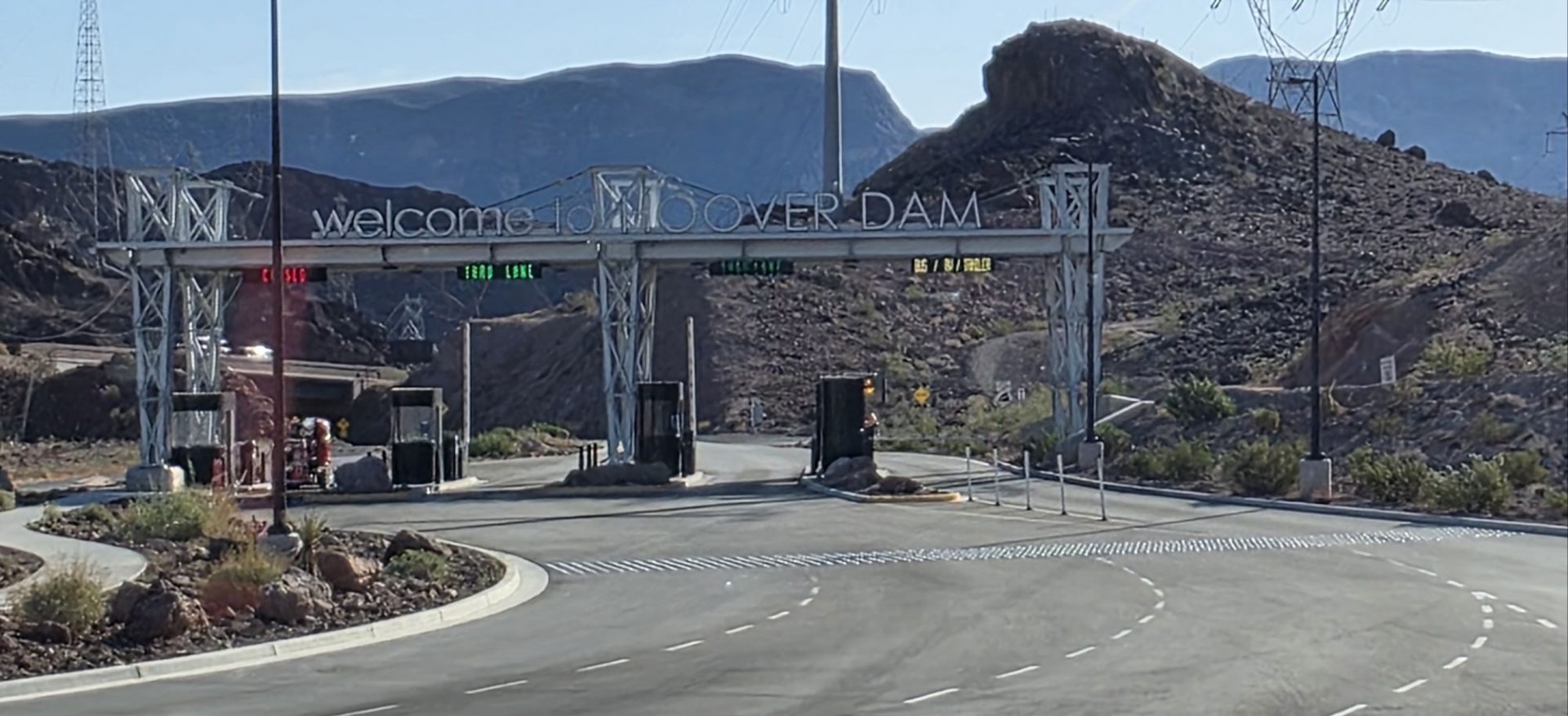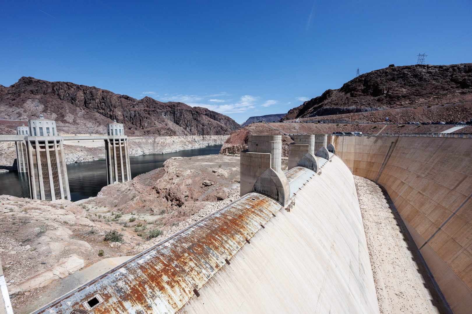 Le Barrage Hoover est une structure voûtée massive située sur le fleuve Colorado, à la frontière entre le Nevada (à gauche du fleuve) et l’Arizona (à droite du fleuve). Construit durant la Grande Dépression (1931-1936), il retient les eaux du lac Mead, le plus grand réservoir des États-Unis en volume. Il fournit de l’électricité, régule les crues et stocke l’eau pour l’irrigation du Sud-Ouest américain. Haut de 221 mètres, il alimente en énergie des millions de foyers, notamment Las Vegas et Los Angeles. Cependant le niveau du lac Mead baisse de façon critique à cause de la sécheresse persistante, menaçant la production électrique.