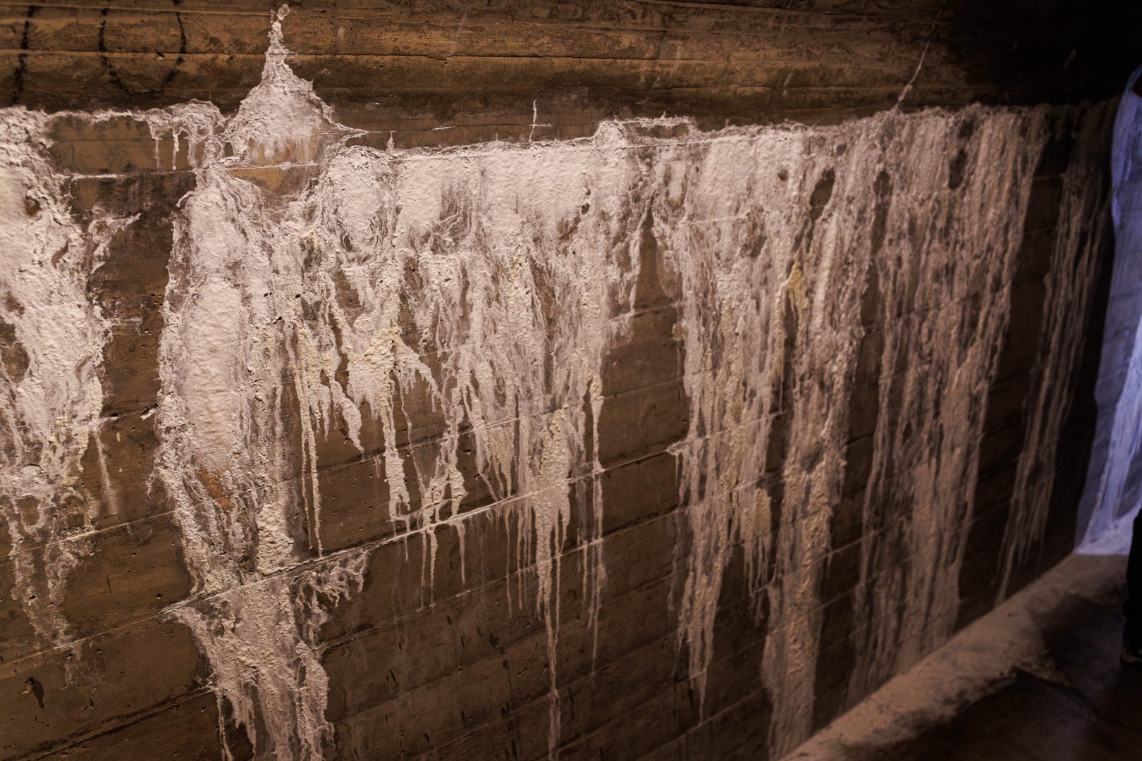 Précipitation : Lorsque cette solution arrive à l’air libre dans les galeries d’inspection, elle réagit avec le dioxyde de carbone (CO2) de l’atmosphère. Cette réaction transforme l’hydroxyde de calcium en carbonate de calcium solide, créant ces traces blanches.