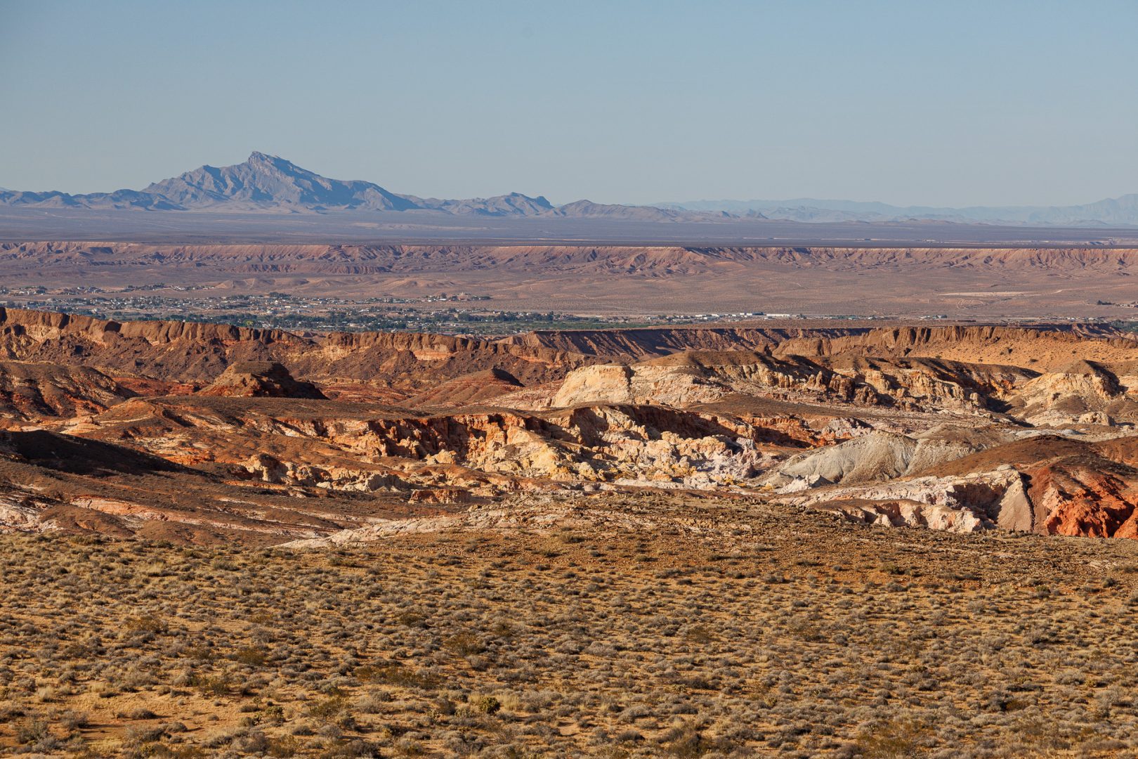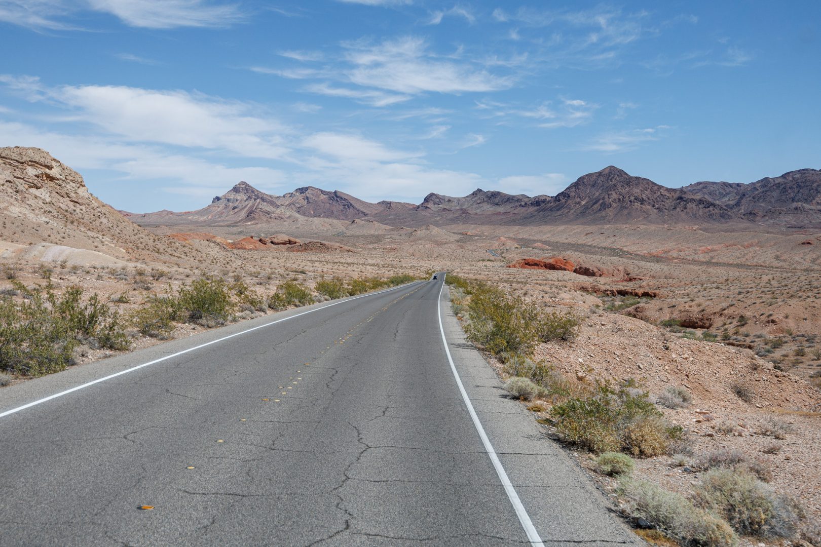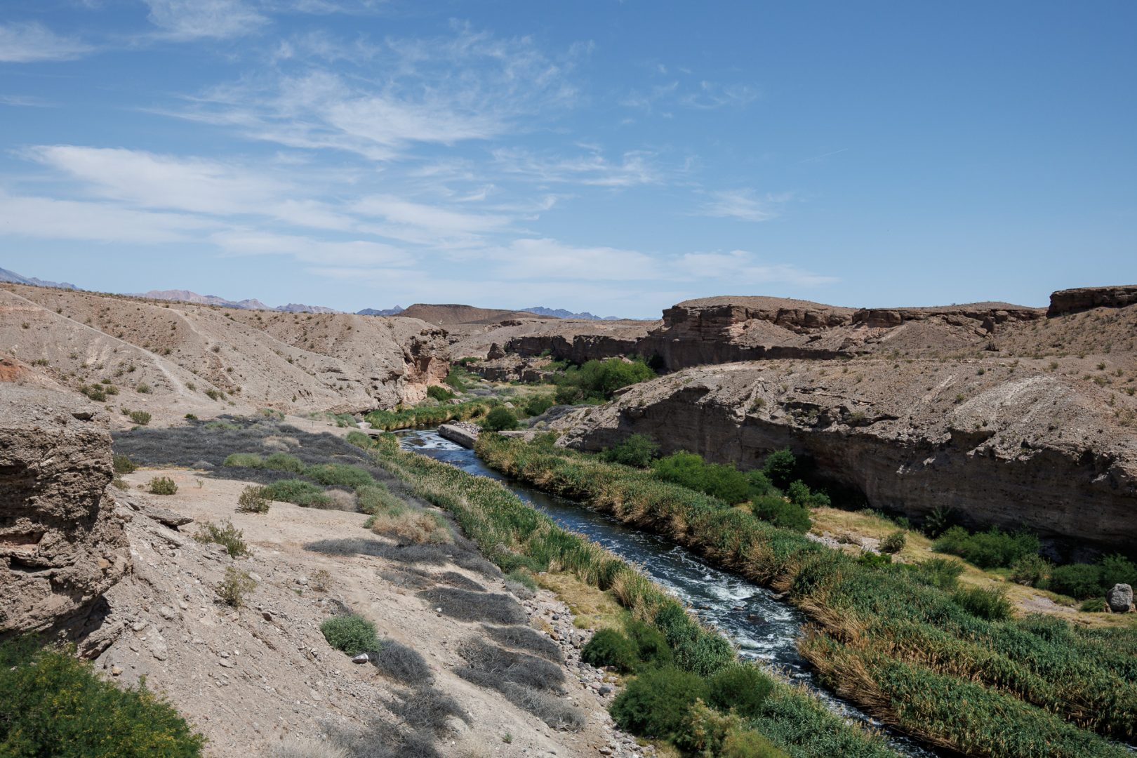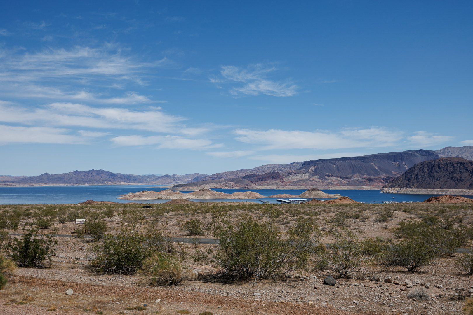 Nous quittons maintenant le barrage et poursuivons vers le nord en longeant le lac Mead qui a une surface de 640 kilomètres carrés lorsque le niveau d’eau est à son maximum. Entre 2020 et 2022, une baisse historique du ruissellement a vidé les lacs Mead et Powell à des niveaux critiques (environ 34 % de leur capacité), forçant les premières coupes fédérales de consommation d’eau en 2022.
