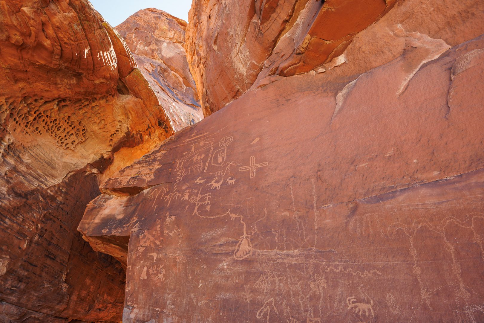 Les pétroglyphes sont gravés dans le « vernis du désert », une fine couche sombre de fer et de manganèse qui se forme sur le grès rouge au fil des millénaires. En grattant cette pellicule noire, les anciens artistes faisaient apparaître le grès orange vif en dessous, créant un contraste saisissant qui perdure encore aujourd’hui.