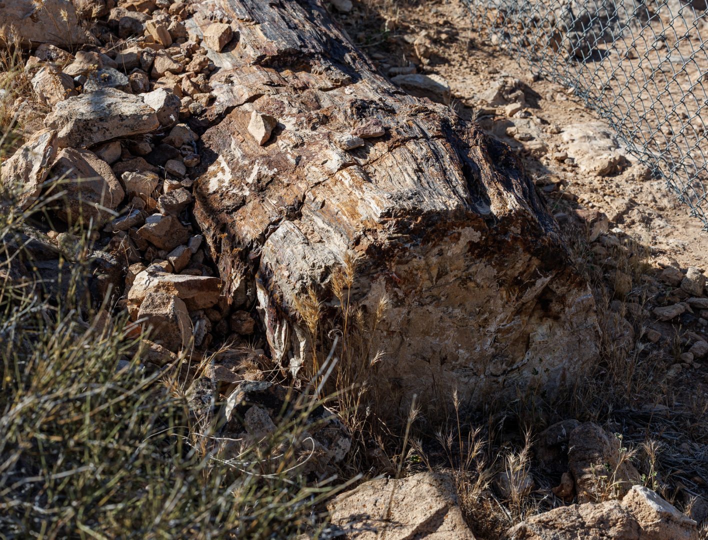 Les troncs pétrifiés (Petrified logs) sont des vestiges de forêts datant d’environ 150 millions d’années. Ces arbres anciens ont été ensevelis par des sédiments et de la cendre volcanique ; la silice a ensuite remplacé la matière organique, transformant le bois en quartz coloré. Les morceaux exposés révèlent des nuances de rouge, de gris et de jaune dues aux oxydes de fer et de manganèse. C’est une preuve fascinante du passage à cet endroit d’une forêt luxuriante à un paysage désertique aride 🙄.