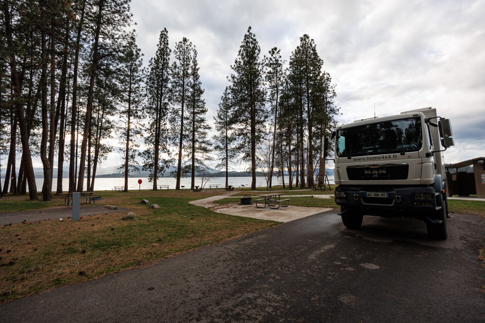 201325 km : Nous quittons notre Harvest Host et nous prenons la route pour seulement 7km 😜. Nous allons nous installer au camping du Flathead State Parc à Finey Point. Comme nous sommes hors-saison, nous avons l’embarras du choix pour notre emplacement. Une petite place au bord du lac nous tend les bras… Alors, nous nous y installons !