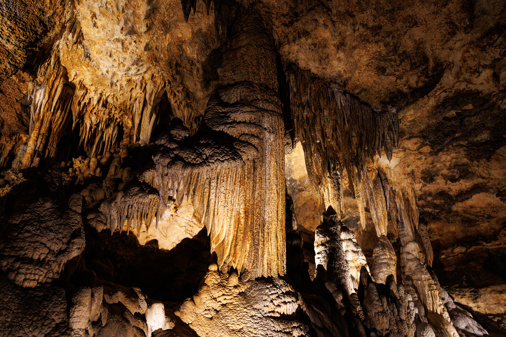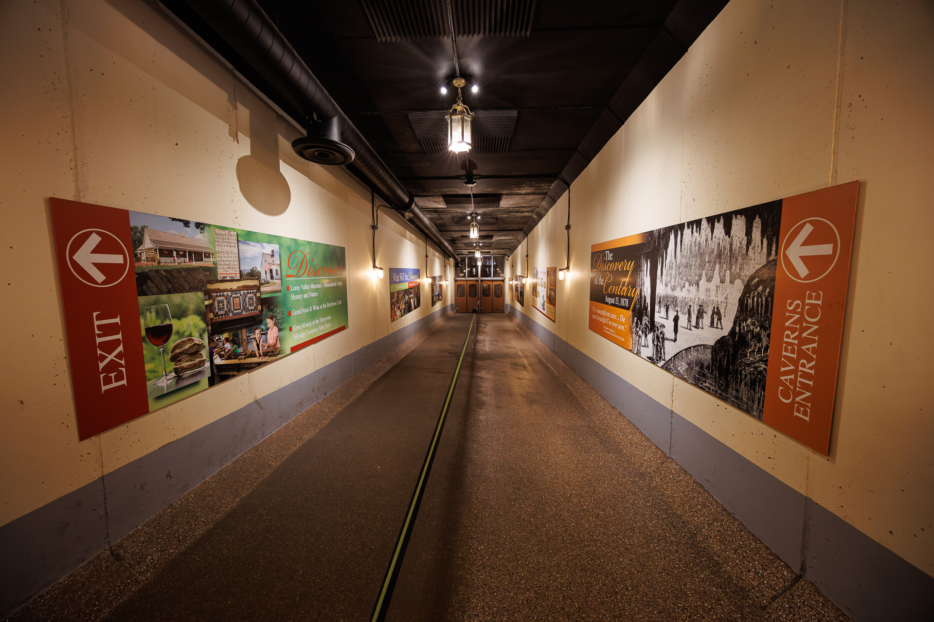 À la recherche d’une caverne, les hommes ont commencé à creuser et, environ quatre heures plus tard, un trou a été créé pour que les plus petits hommes (Andrew et Quint) puissent se faufiler, glisser le long d’une corde et explorer à la lueur des bougies. La première colonne qu’ils ont vue a été nommée la colonne de Washington, en l’honneur du premier président des États-Unis. En entrant dans la zone appelée la gorge de Skeleton, des fragments d’os (entre autres artefacts) ont été trouvés enfouis dans la calcite. D’autres traces d’occupation humaine antérieure incluent des morceaux de charbon de bois, de silex et de fragments d’os humains incorporés dans la stalagmite. Un squelette, que l’on pense être celui d’une fille amérindienne, trouvé dans l’un des gouffres, a été estimé, à partir du taux actuel de croissance stalagmique, à ne pas avoir plus de 500 ans. Ses restes se sont peut-être glissés dans les cavernes après l’effondrement de son trou funéraire à cause d’un gouffre, bien que la véritable cause soit inconnue.