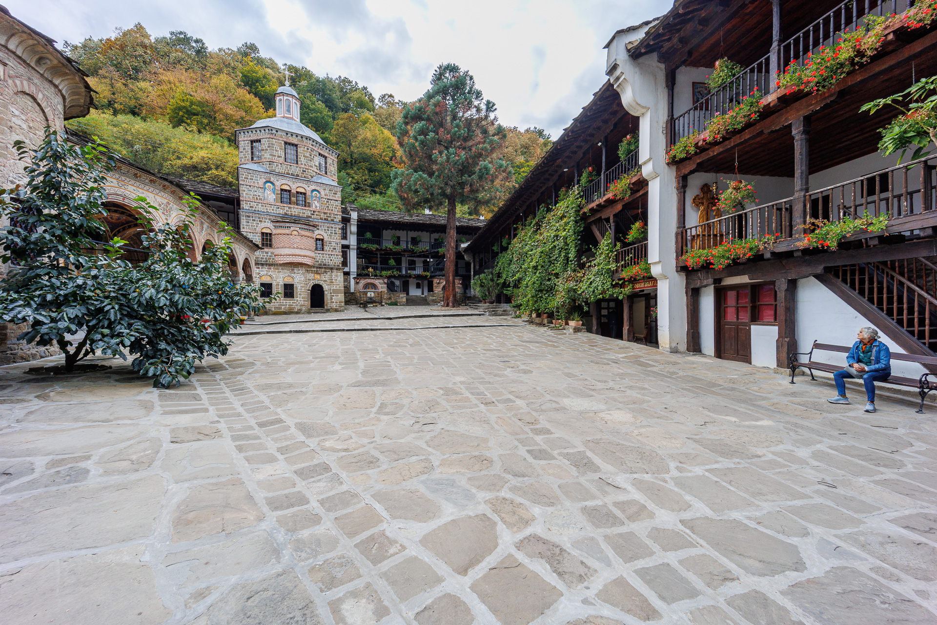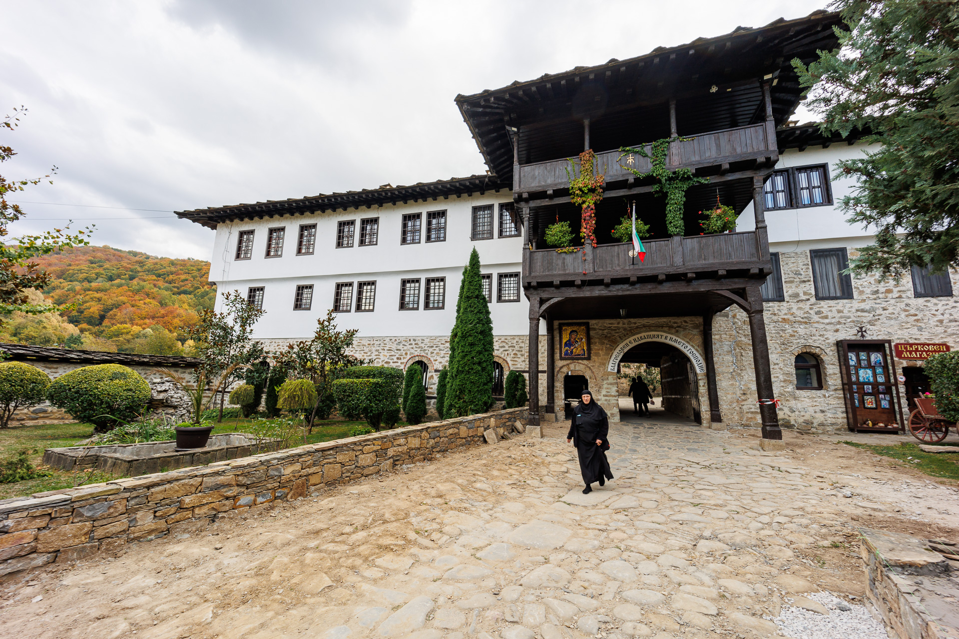 Nous voilà arrivés au monastère de Troyan. Le monastère de Troyan (dit Troyanski) est le plus grand monastère orthodoxe dans la chaîne du Balkan et le troisième plus grand monastère bulgare. Il est dédié à Sainte-Marie. Les origines du monastère de Troyan remontent vers l’an 1600 lorsqu’un moine et son disciple s’établirent sur ces lieux. Un simple chalet en bois résumait alors toute la sainte présence monastique.