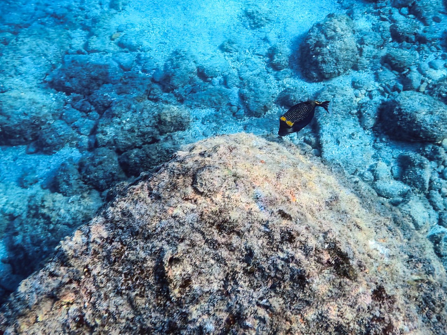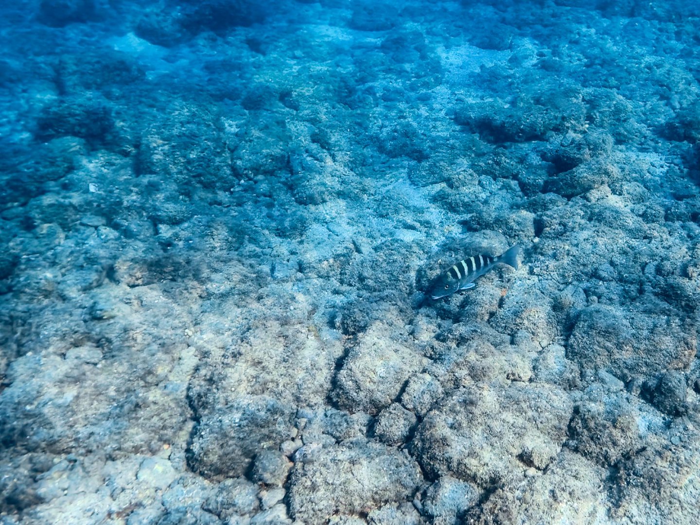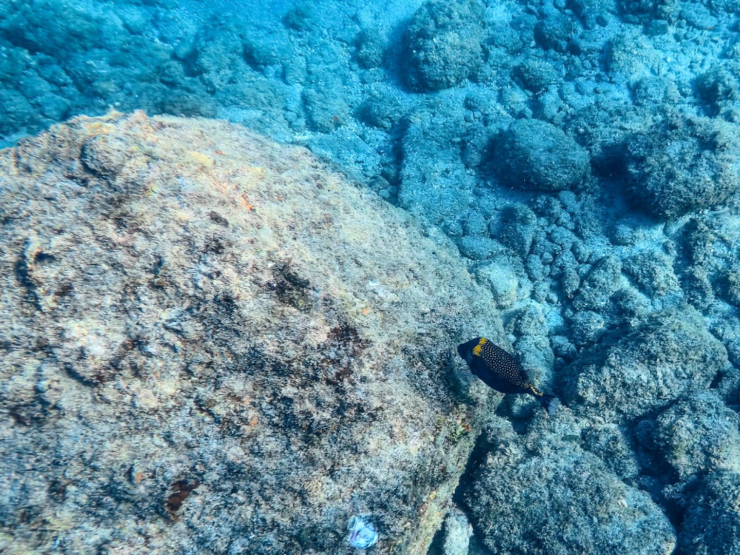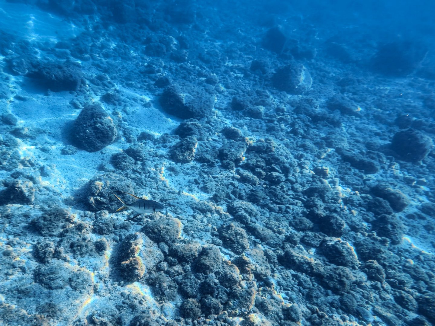 Notre belle balade en snorkeling est terminée. La sortie de l’eau est un peu sportive car il faut marcher sur des gros cailloux recouverts de mousse avant de rejoindre la plage de sable… Ça glisse un peu ⛸️