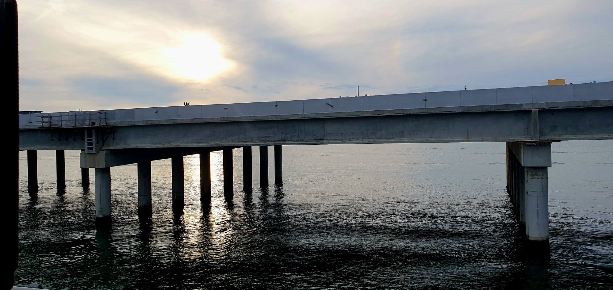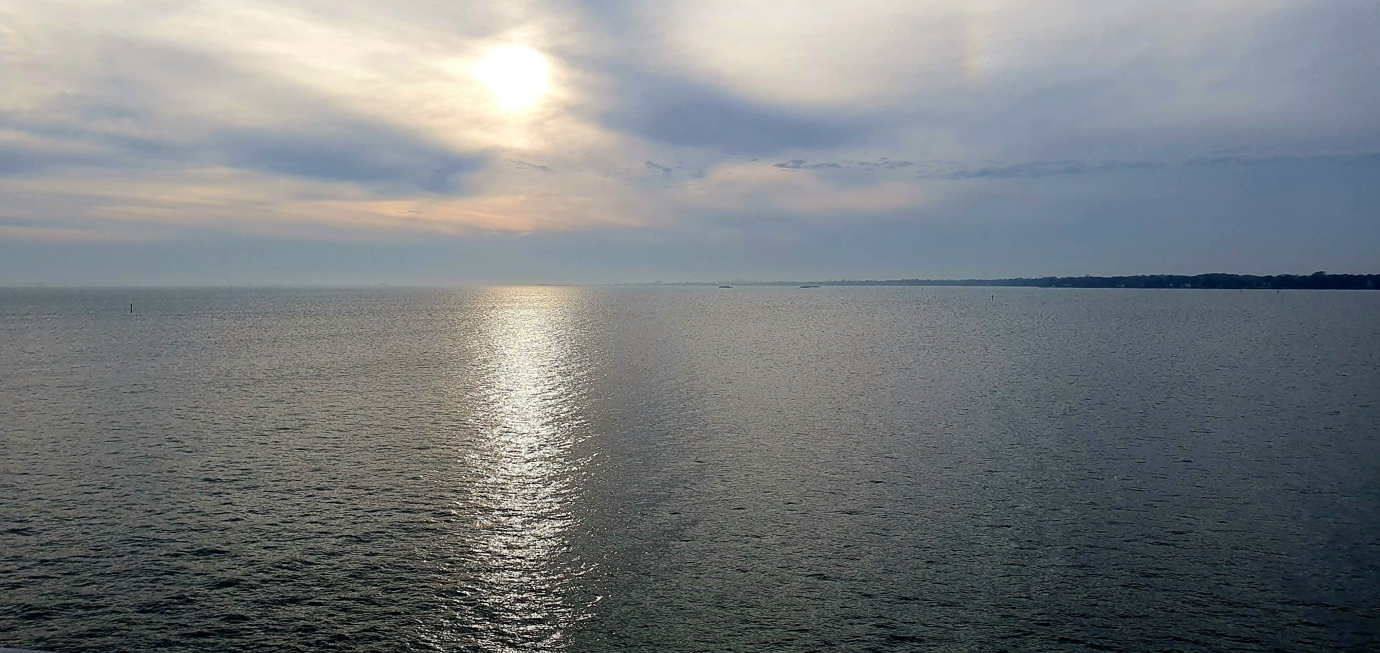 Nous traversons la Pasquotank River accompagnés par un joli coucher de soleil.