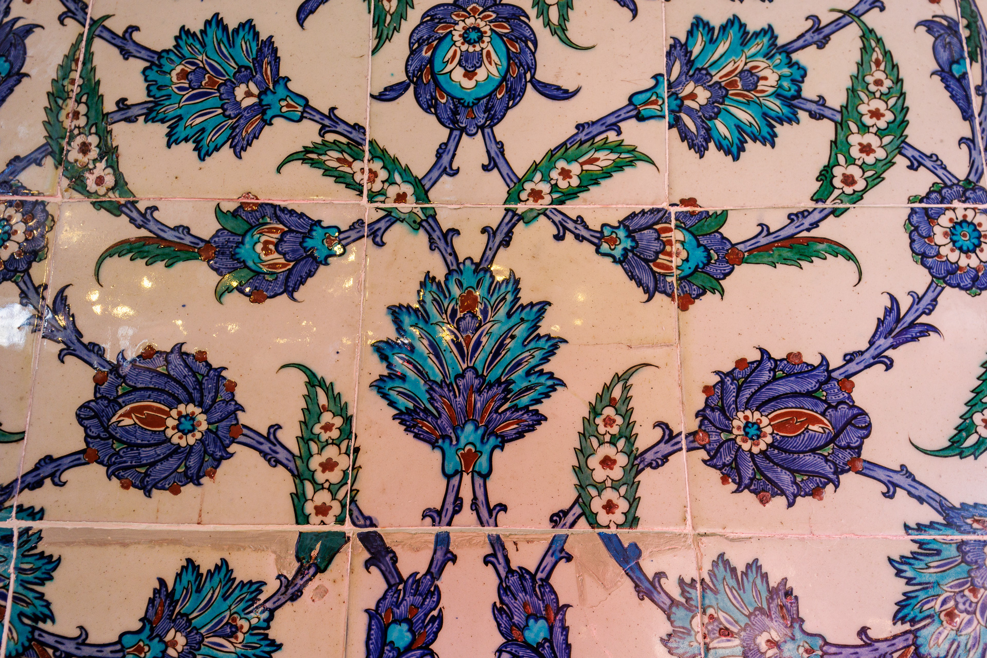 La coupole est soutenue par quatre piliers massifs dits en « pattes d’éléphants » et contrebutée par quatre demi-coupoles. 260 fenêtres inondent l’édifice de lumière. L’intérieur est décoré de 21 043 carreaux de faïence d’Iznik à dominante bleue, d’où la mosquée tire son surnom. C’est juste magnifique, comme dirait une amie voyageuse !!!