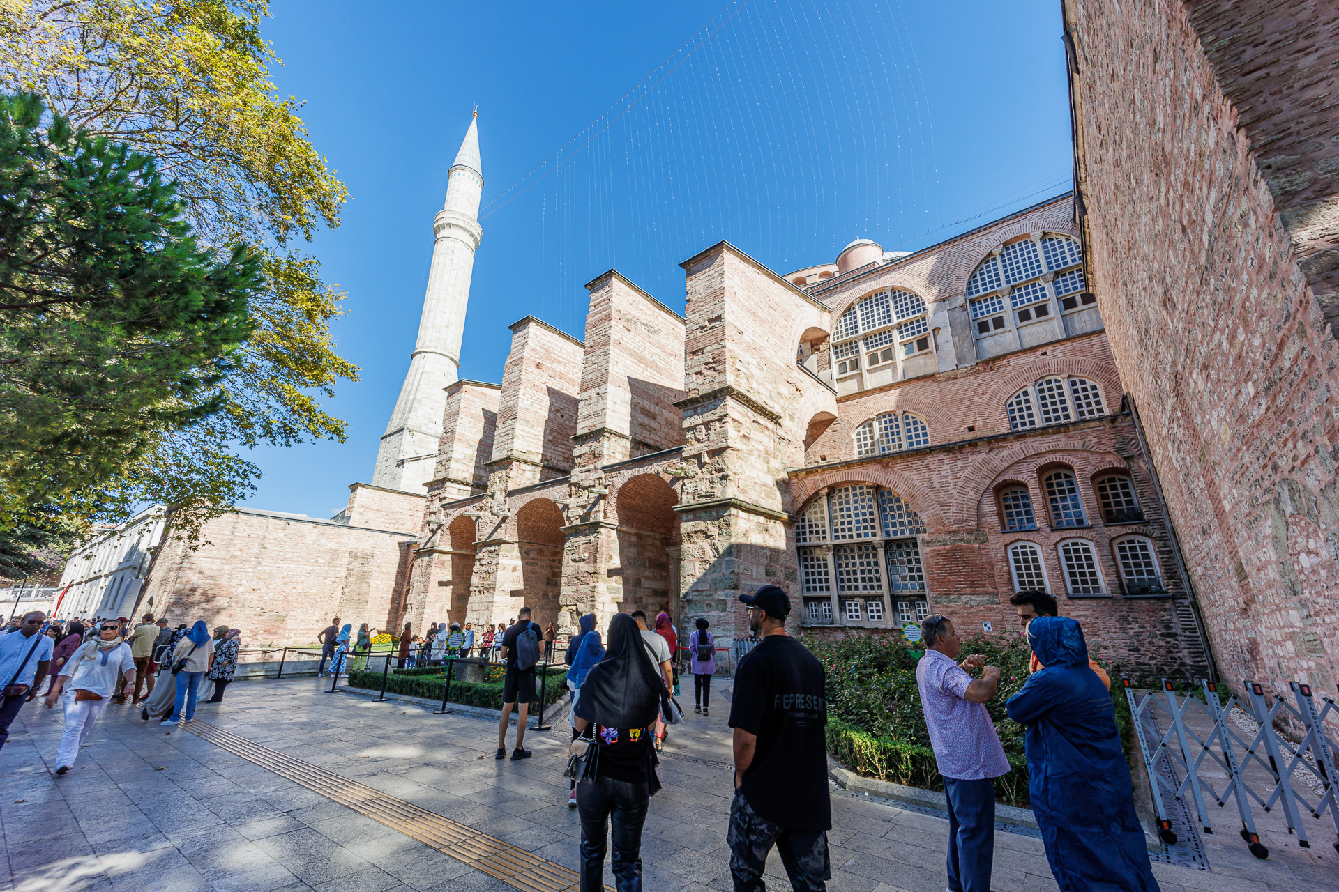 Direction ensuite vers Sainte-Sophie à 300 mètres de là. Sainte-Sophie (du grec Ἁγία Σοφία, Hagía Sophía, soit « sagesse de Dieu », « sagesse divine », nom repris en turc sous la forme Ayasofya) est une ancienne basilique chrétienne construite au 4ème siècle. Elle fut reconstruite bien plus grande au 6ème siècle sous l’empereur byzantin Justinien, où elle acquiert sa forme actuelle. Elle est classée au patrimoine mondial de l’UNESCO depuis 1985.