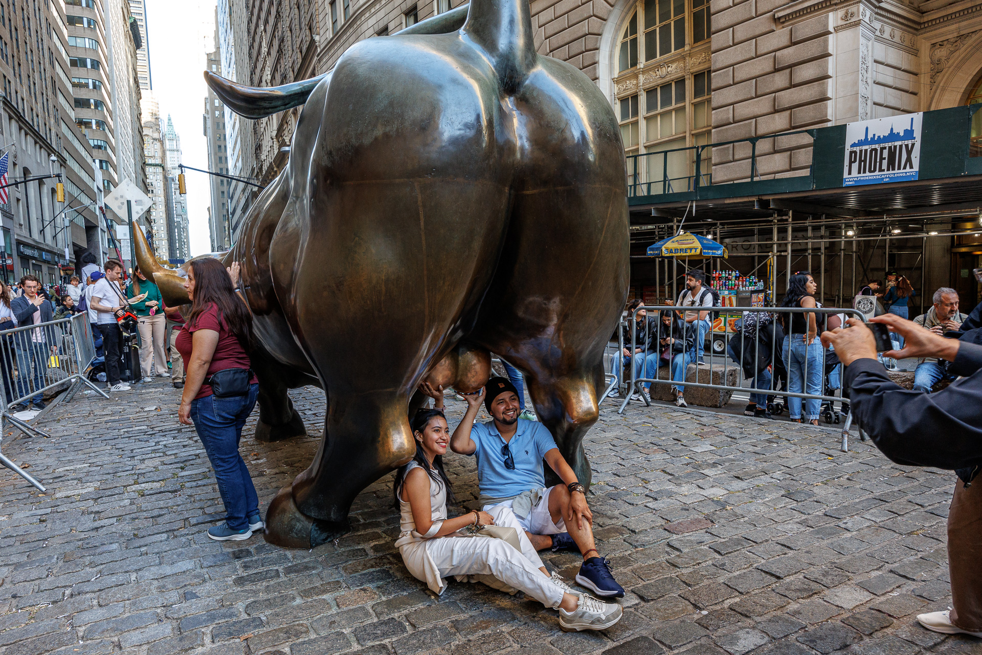 Et voilà le Taureau de Wall Street (Wall Street Bull). Il s’agit d’une sculpture en bronze de l’artiste italien Arturo Di Modica. La sculpture pèse 3,2 tonnes, mesure 3,4 mètres de haut et 4,9 mètres de long. Selon l’artiste, la sculpture est le symbole de la force, du pouvoir et de l’espoir du peuple américain pour le futur.