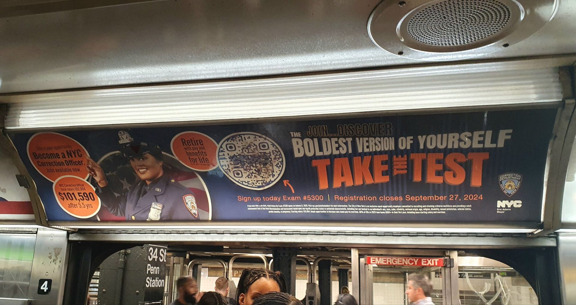 Encore une belle journée New-Yorkaise qui s’achève 🤩 ! En prenant le métro pour rentrer au camion, nous tombons sur cette affiche dans notre wagon. Elle concerne le recrutement d’agent pénitentiaire. Le salaire de base est de 52804$ à l’entrée (48734€) et de 101590$ (93760€) au bout de 5 ans et demi, retraite avec salaire et autres avantages acquis à vie… On comprend mieux les pizzas à 35€ 🙄