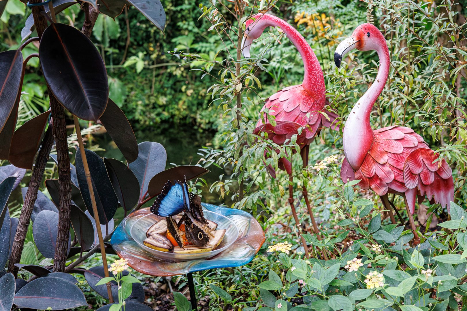Mais que font tous ces papillons dans l’assiette semblent s’interroger ces 2  flamants roses… ça ne se fait pas de mettre les pieds dans le plat 🤣 !