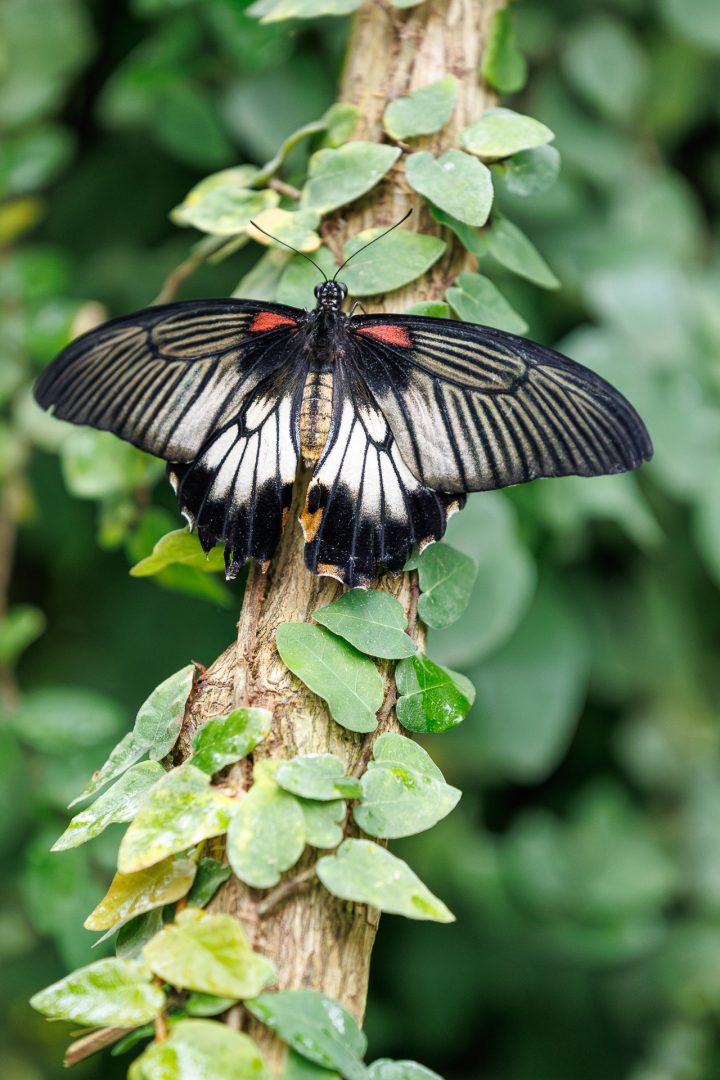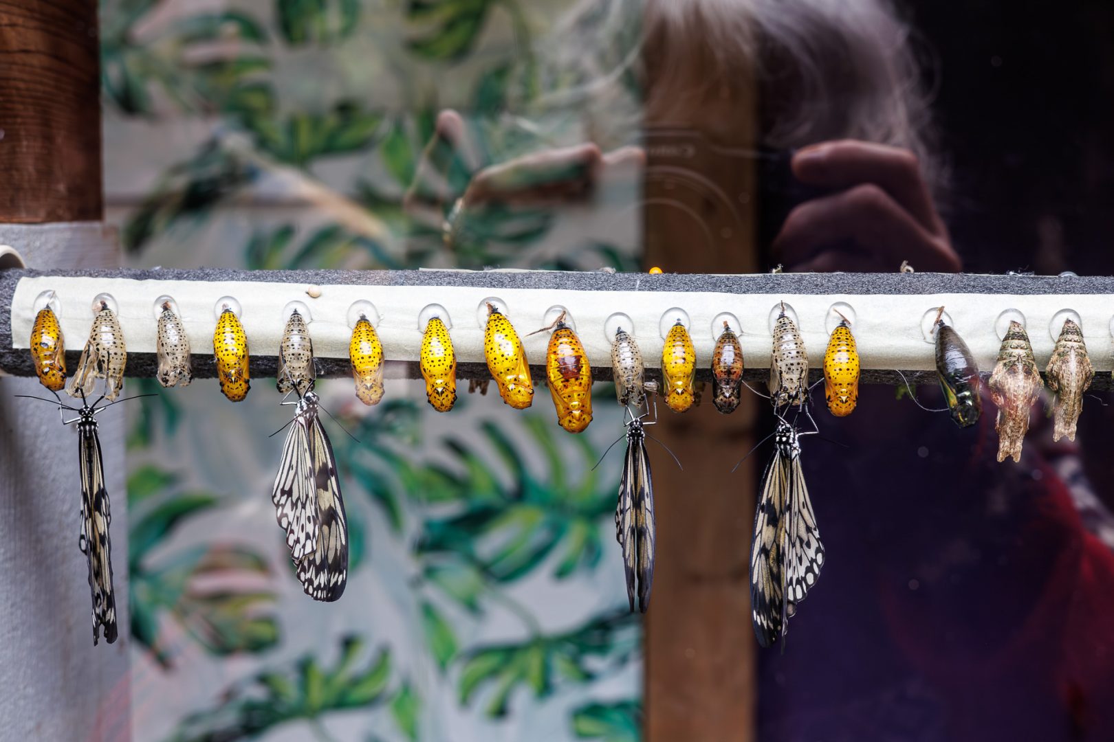 Nous passons devant la nurserie.  Il reste encore quelques papillons en attente de « finition ». A la sortie du cocon, le papillon gonfle ses ailes chiffonnées en y injectant de l’hémolymphe, un fluide corporel qui sert à former les ailes et à durcir les nervures. Ce processus prend entre une à cinq heures et permet aux ailes de s’étendre et de se durcir. Une fois les ailes sèches, le papillon peut s’envoler pour se nourrir de nectar et trouver un partenaire pour se reproduire. Il doit se dépêcher car la plupart des papillons adultes ne vivent qu’une ou deux semaines 😲 !