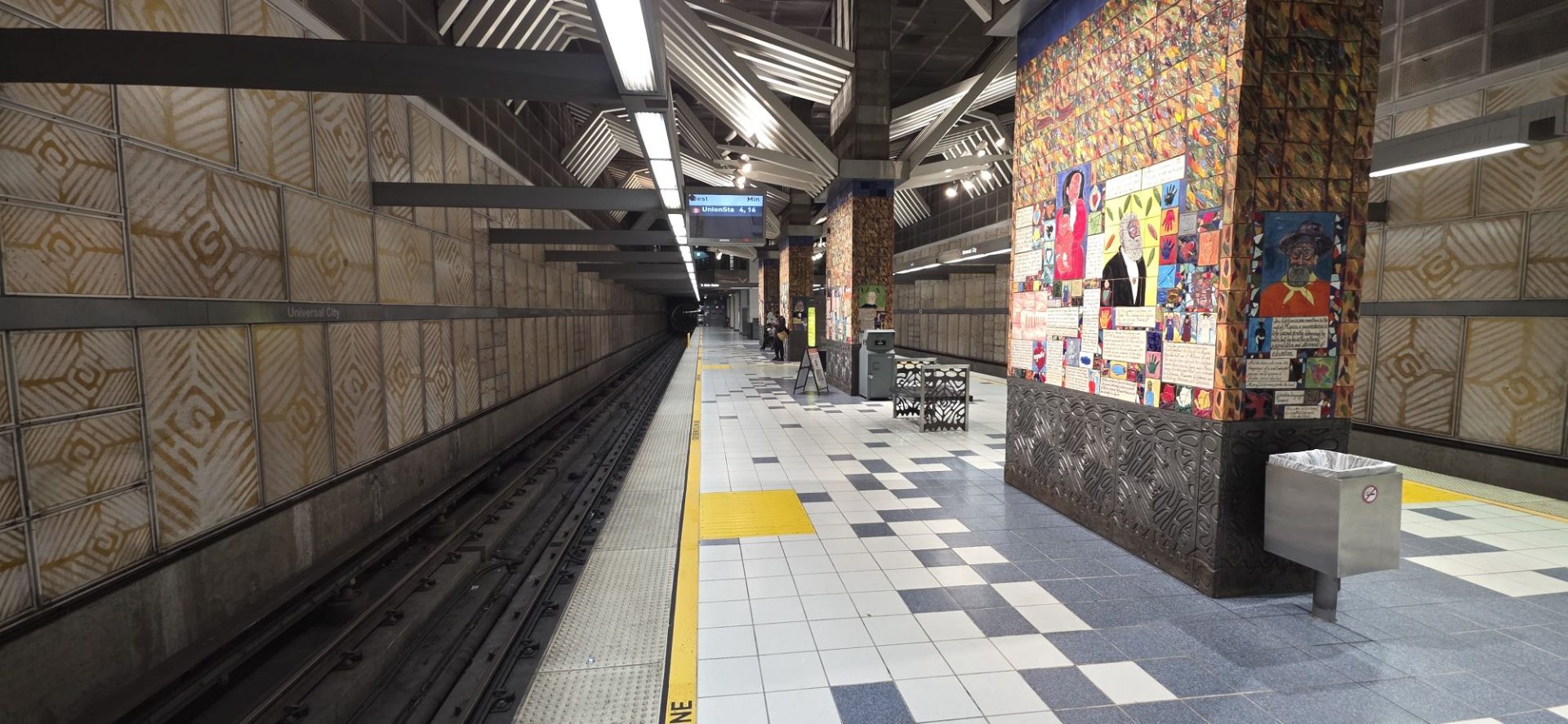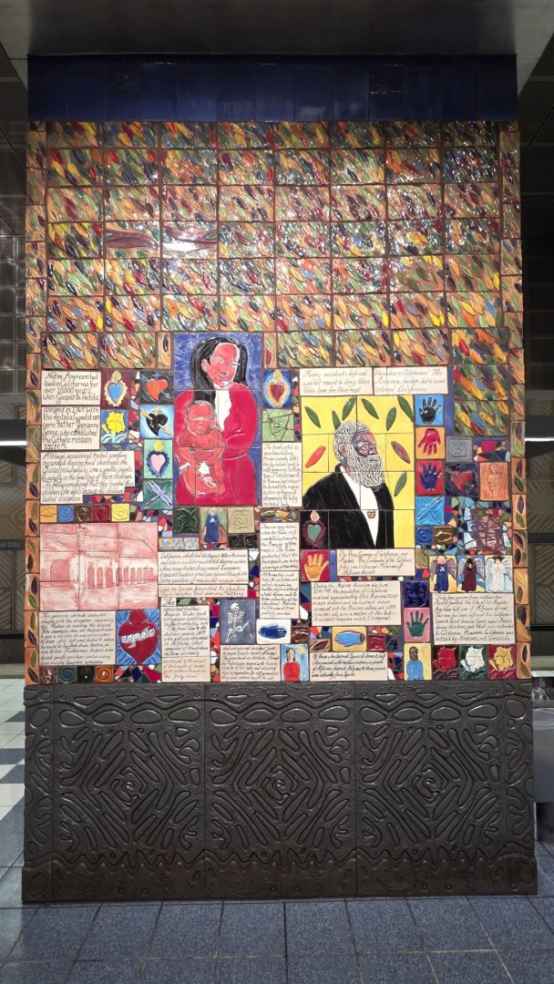 Ce panneau dans le métro illustre la diversité culturelle de la Californie et met en avant l’apport essentiel des communautés autochtones, africaines, asiatiques et mexicaines dans la construction de l’histoire de l’État, tout en reconnaissant les injustices, souffrances et inégalités qu’elles ont subies. Rappel mémoriel intéressant.