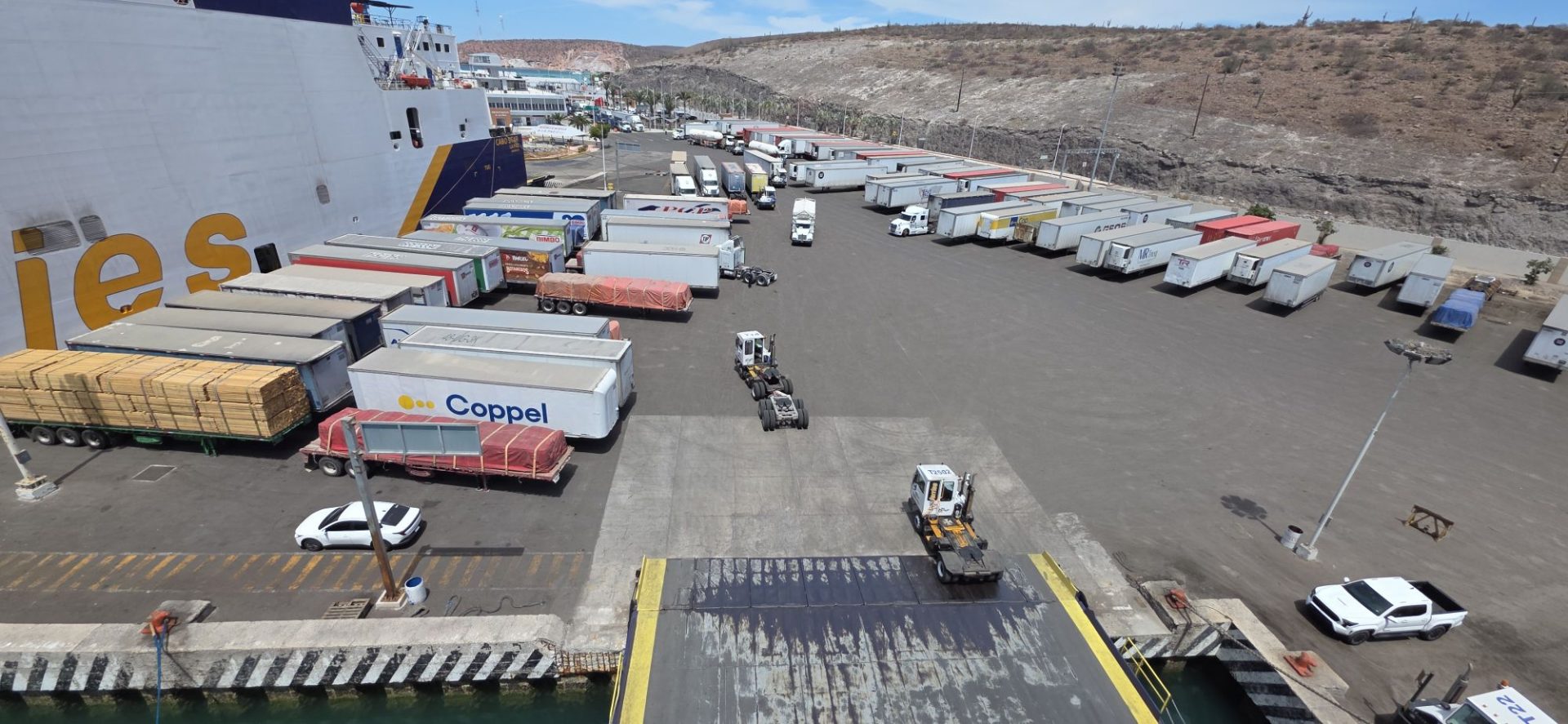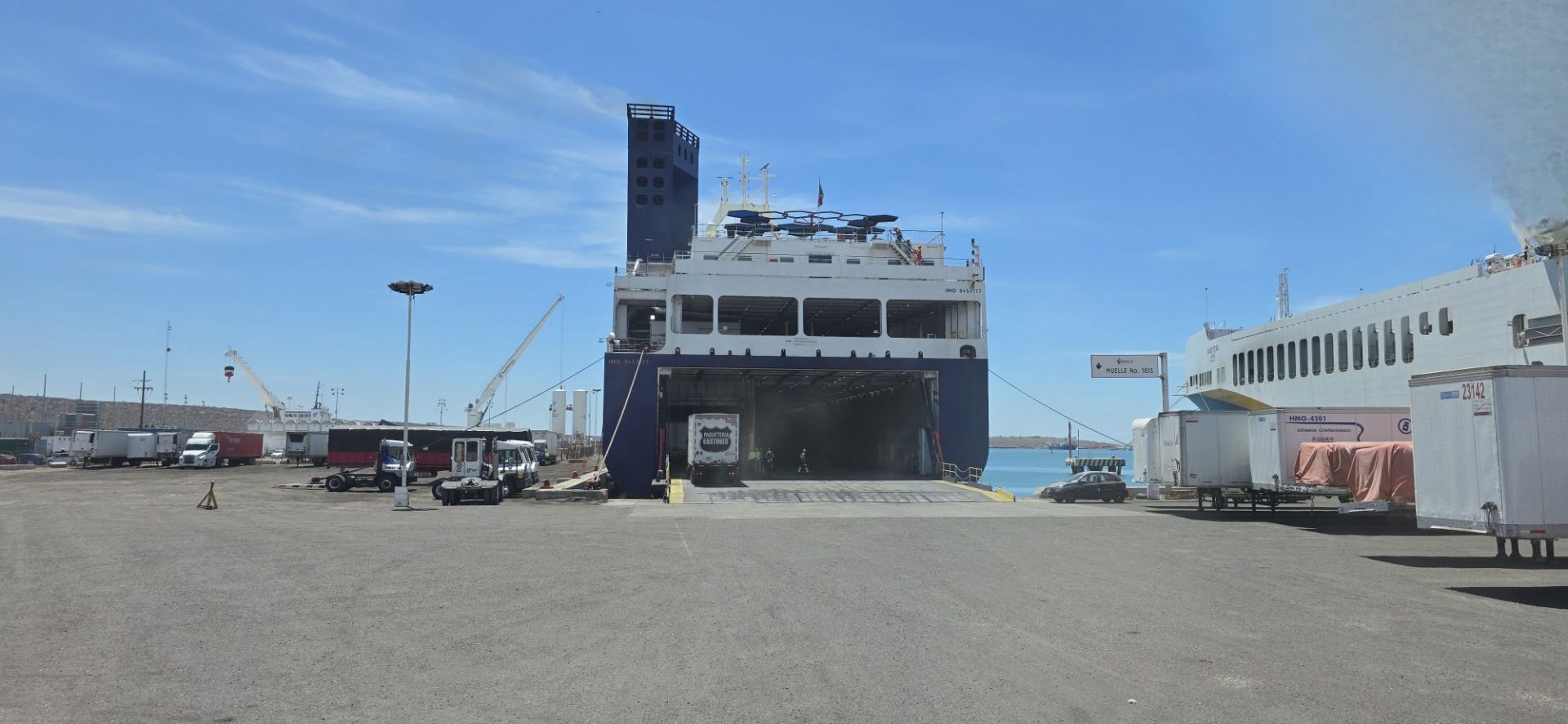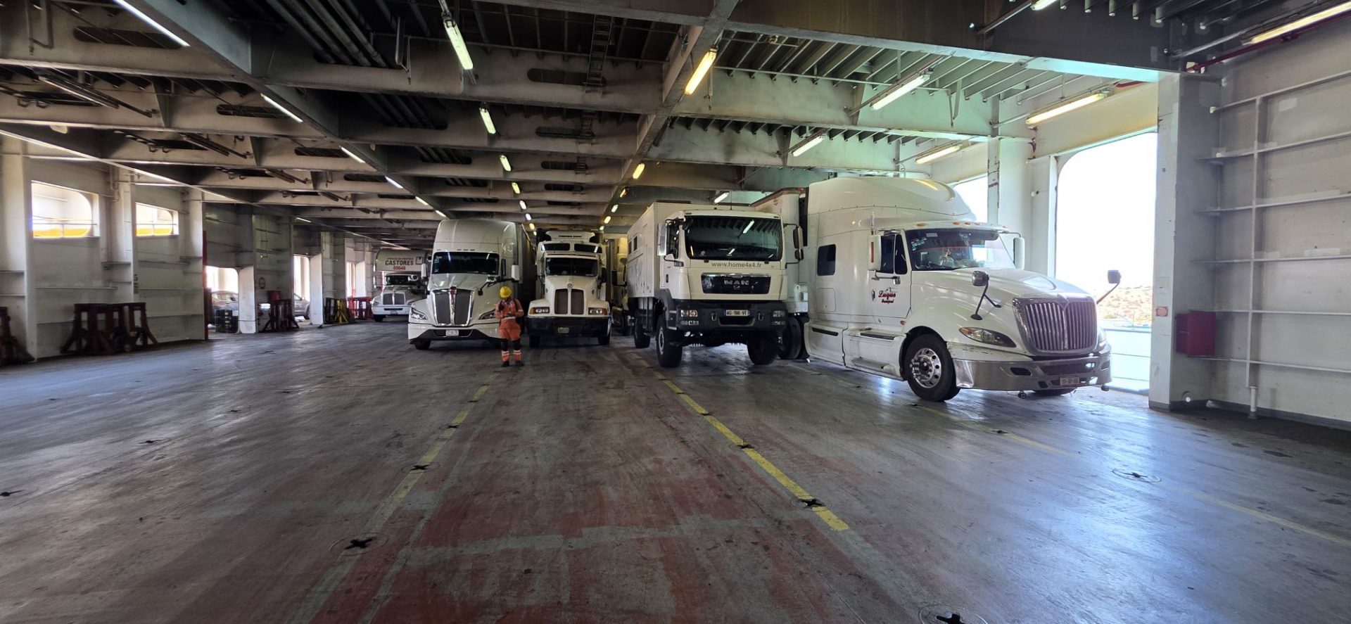 Nous voilà arrivés au port maritime de Pichilingue. Voici encore une fois le type de camion que nous croisons sur les routes… ils sont immenses 🙃 ! Heureusement pour les chauffeurs, dans le bateau, ils sont chargés remorque par remorque 😉.