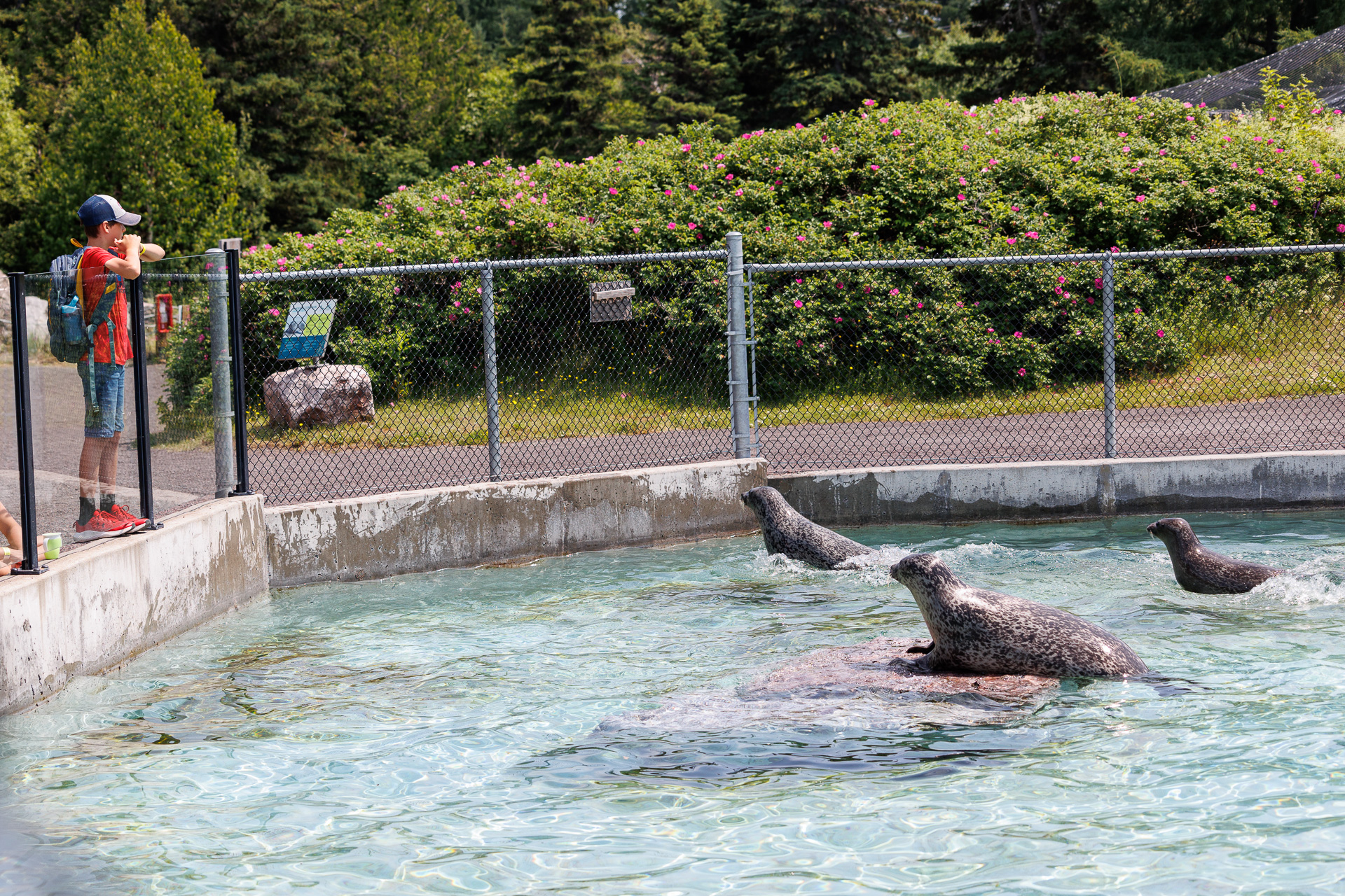 C’est le moment où les otaries s’amusent et sautent pour récupérer la nourriture car sinon, elles tournent en rond dans leur petite piscine.
