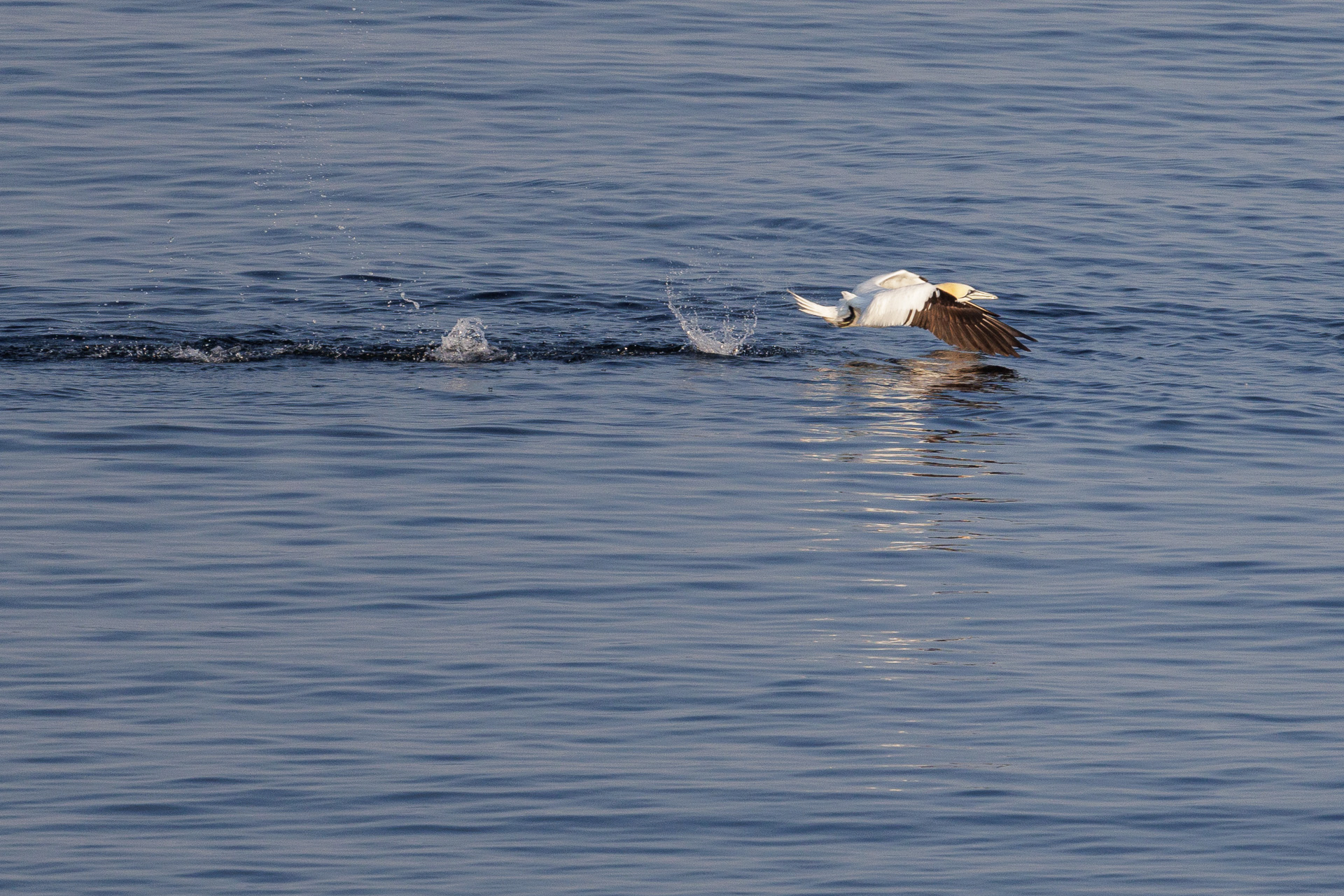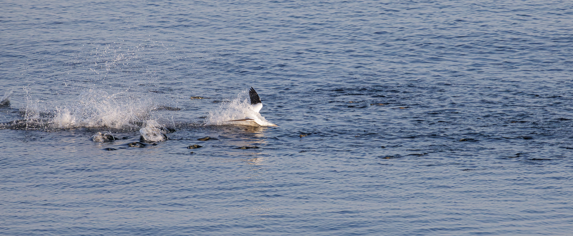 Il y a, à proximité des falaises, des bancs de poissons énormes et les fous s’en donnent à cœur joie. Certains poissons, visibles sur la photo, semblent quand même trop gros pour les fous… Il paraît que ce sont des bars rayés.