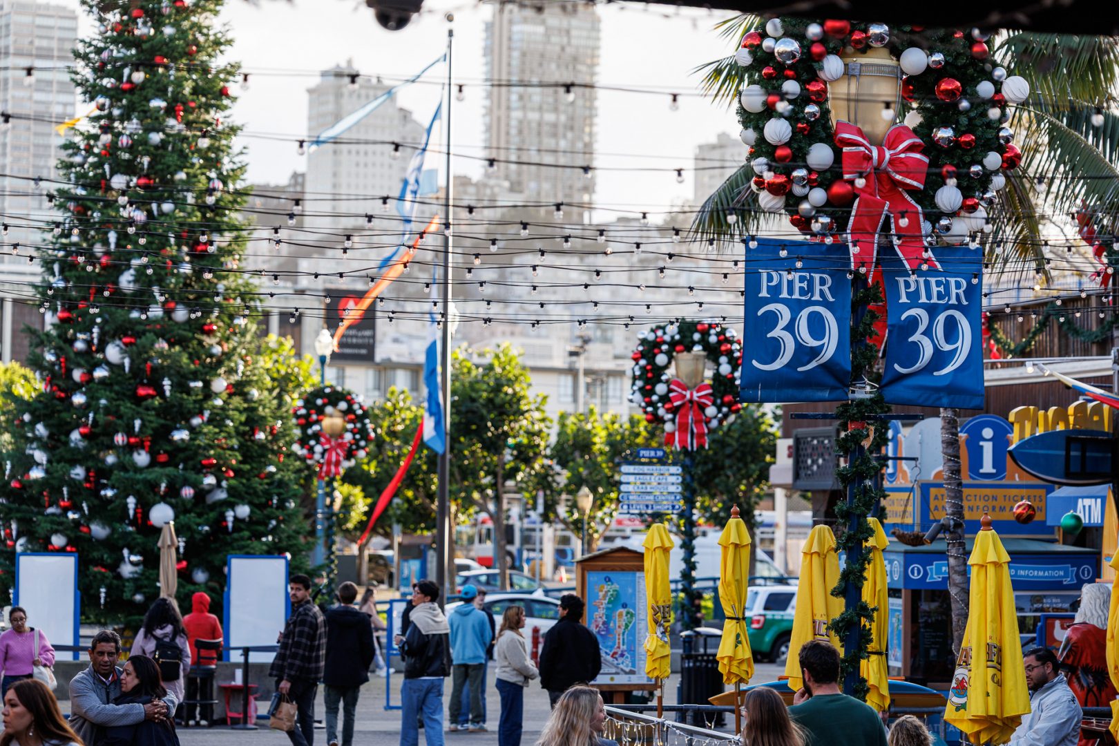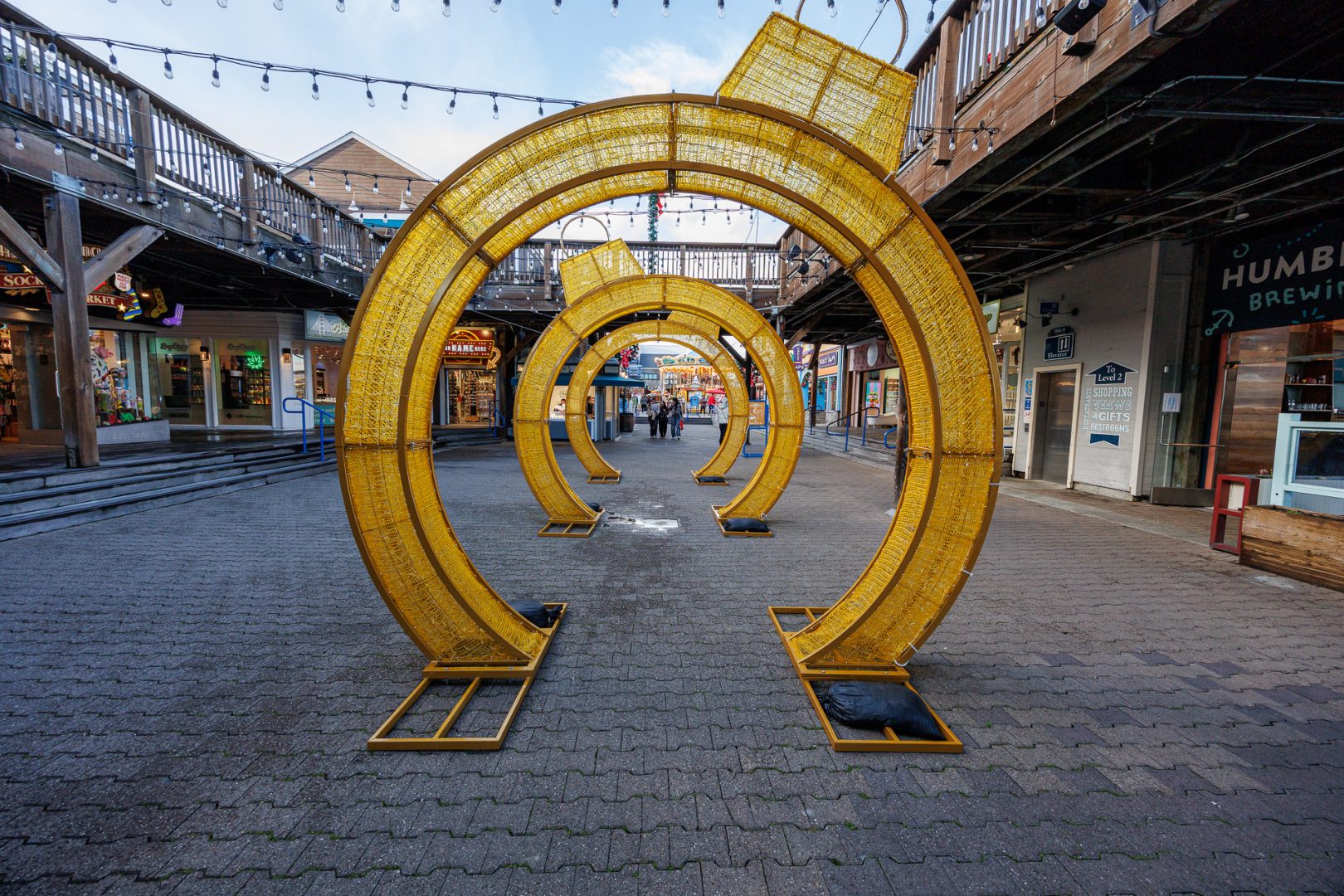 Nous n’avons pas eu le mal de mer, mais cela bougeait quand même un peu. Drôle d’impression que de se sentir enfermé dans une boîte qui pourrait couler 🤣. C’est donc vaillants sur nos jambes que nous nous dirigeons vers le Pier 39. Noël se prépare… les guirlandes sont déjà là.