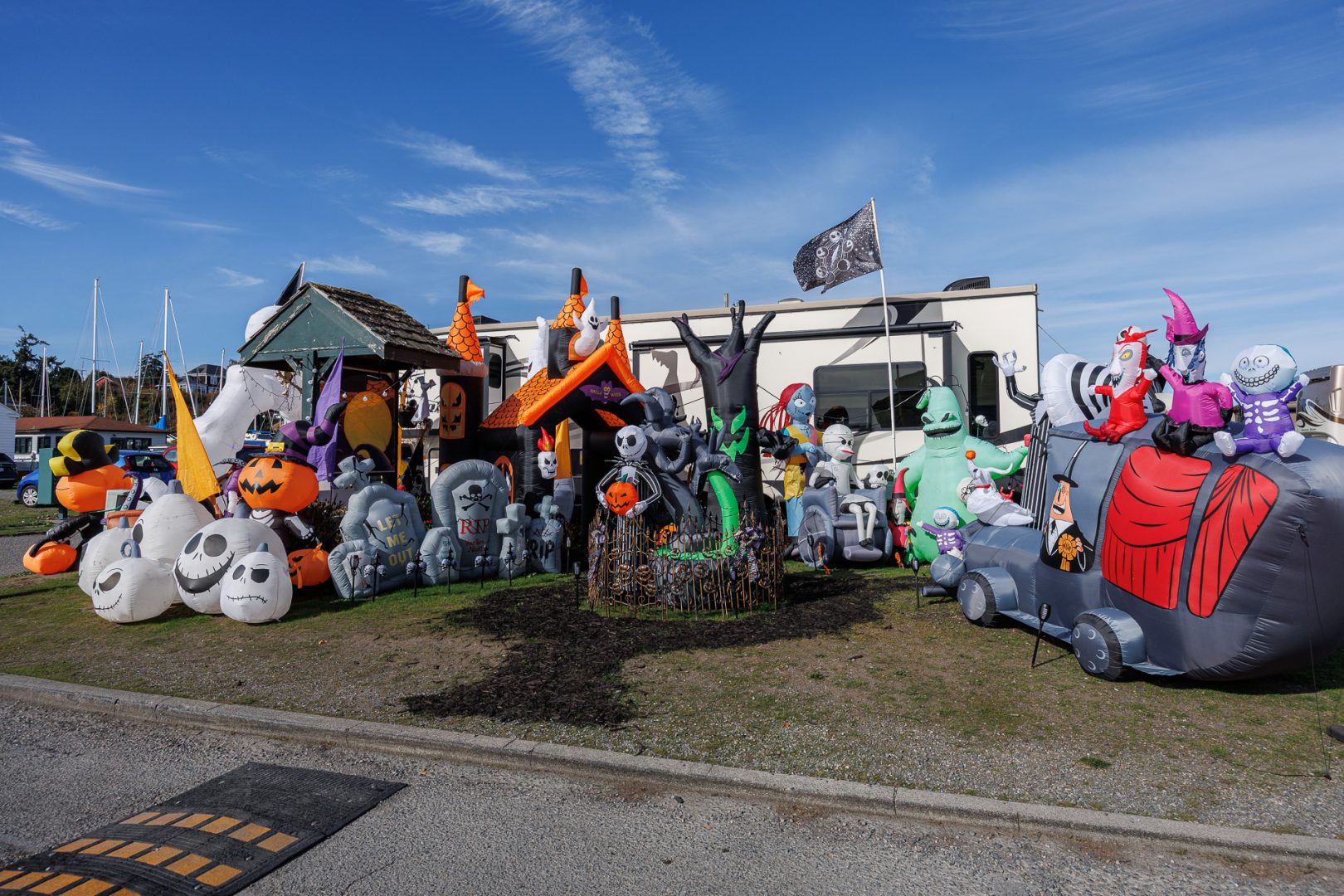 Au bout de la marina se trouve le camping. Nous découvrons cette caravane prête à accueillir toutes les créatures effrayantes d’Halloween 🎃