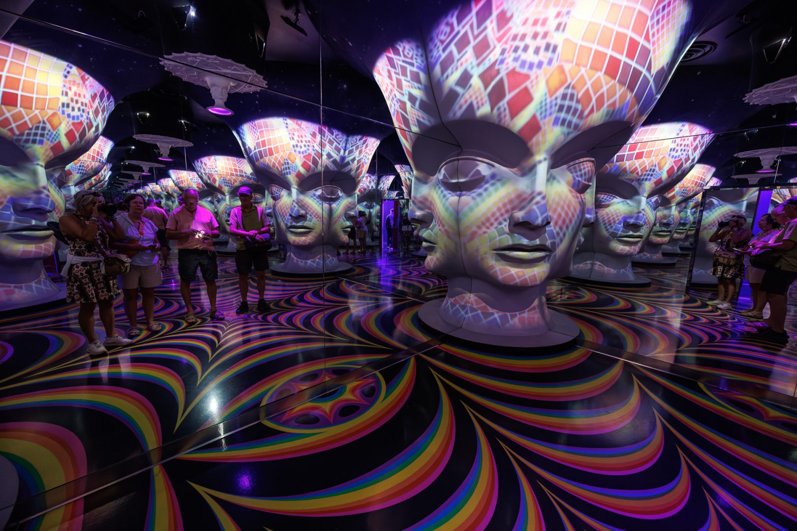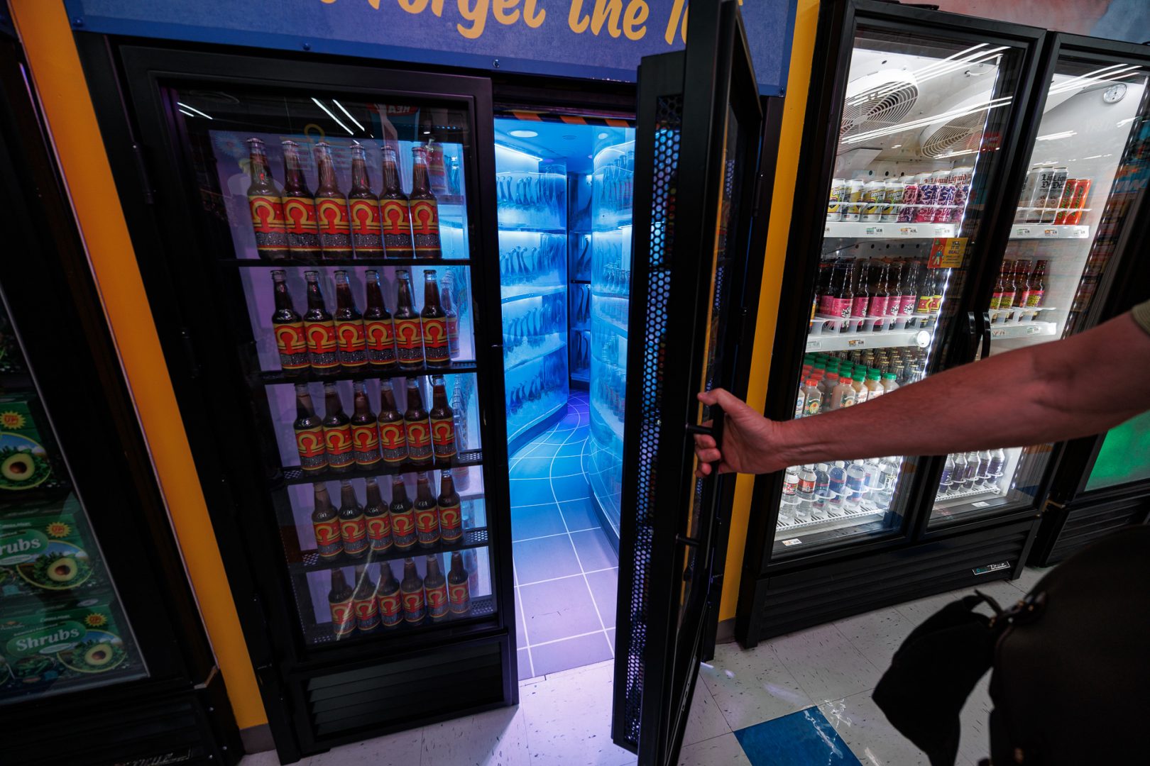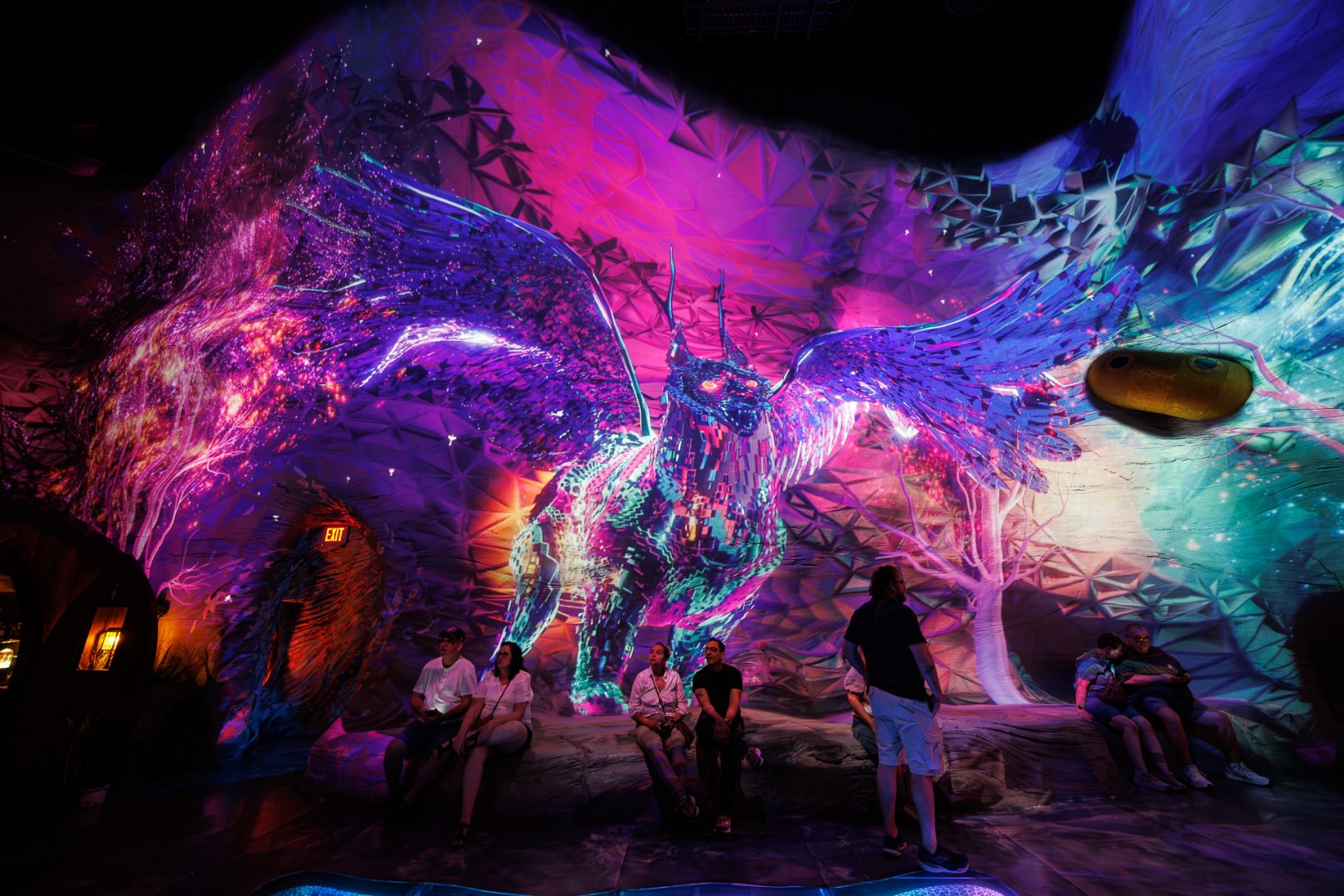 Nous voilà arrivés à Meow Wolf Las Vegas’ Omega Mart. C’est un lieu de divertissement avec des attractions en réalité virtuelle et de l’art interactif. Nous nous dirigeons vers Omega Mart, un supermarché bien étrange 🤔. C’est par ce réfrigérateur que nous pénétrons dans un autre univers. Mais où allons-nous ? 😱