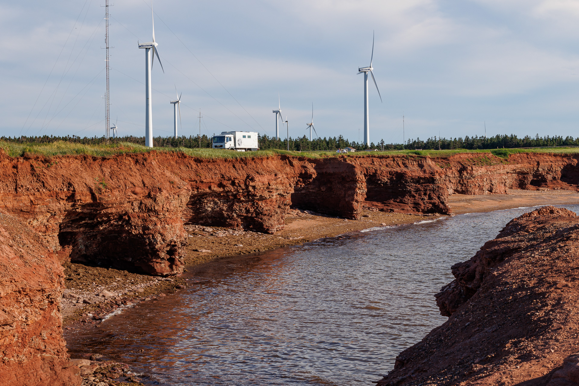 North Cape jouit d’une exposition au vent sur 300 degrés. C’est l’endroit idéal pour implanter des éoliennes et les tester ! Il constitue également un site de production électrique performant. L’Institut teste 3 types d’éoliennes de 1,3 , 2 et 3 mégawatts. il n’y a actuellement qu’une seule éolienne de 3 mégawatts. Elle mesure 80 mètres de haut et les pales décrivent un cercle de 90 mètres dans le ciel. On va aller voir le phénomène 😜 !