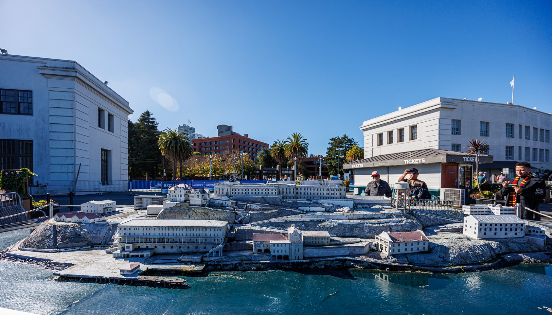 219667 km : Toujours pas de traversier ce matin 😫, aussi nous reprenons le bus pour nous rendre au Pier 33. Notre destination du jour est l’île d’Alcatraz, là où se situait le célèbre pénitencier. Avant d’embarquer sur le ferry, nous passons devant une maquette : il y avait un certain nombre de bâtiments sur l’île !
