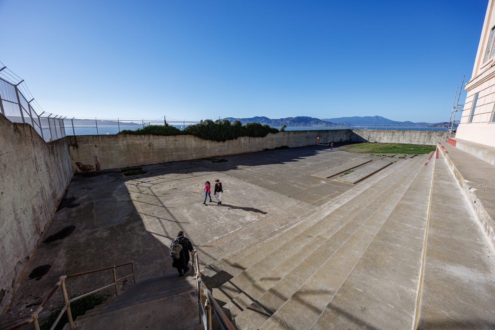 Depuis le bâtiment carcéral, nous accédons à la cour de récréation. Nous sommes surpris par sa taille. Nous l’imaginions plus petite et plus sombre… Les prisonniers d’Alcatraz bénéficiaient généralement d’une heure de sortie par jour dans la cour de récréation, sous surveillance stricte et sous réserve de bonne conduite. On y pratiquait des sports comme le baseball et le handball, ainsi que des jeux plus calmes comme les échecs, les dames et le bridge.