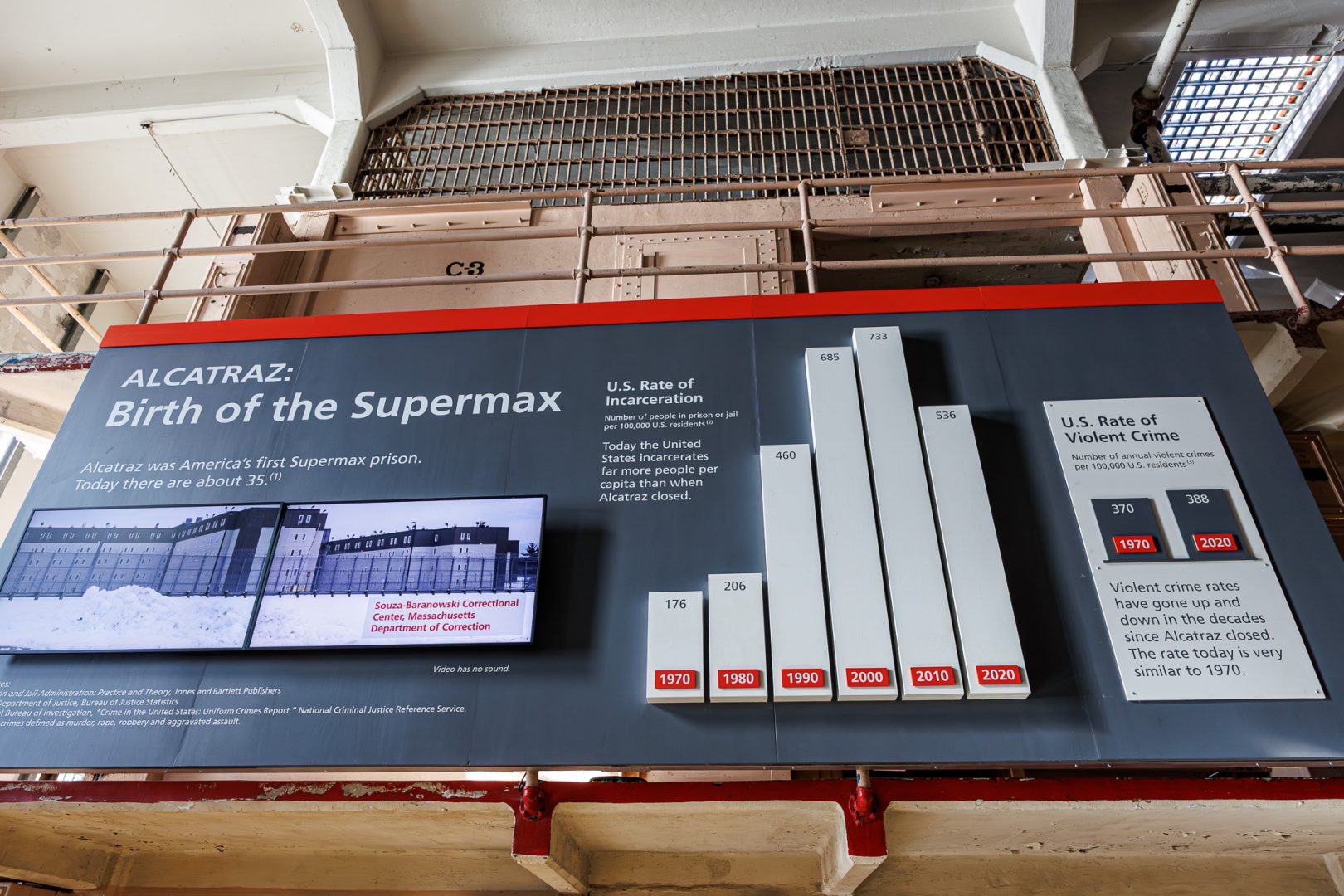 En regardant le tableau ci-dessous, nous apprenons qu’Alcatraz a été le premier pénitencier de haute sécurité (prisons Supermax) créé en 1934. Aujourd’hui il en existe 35 répartis sur tout le territoire américain. Après une explosion du taux d’incarcération en 2010 (733 prisonniers pour 100000 habitants), il a bien baissé en 2020 avec un taux de 536 (ce taux était de 110 en France en juillet 2023).