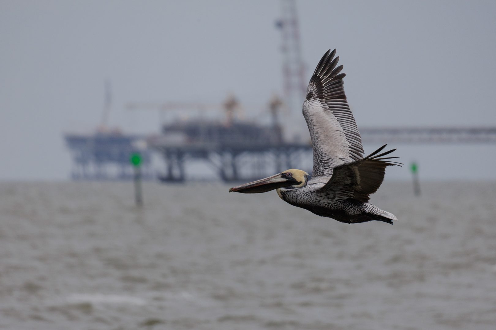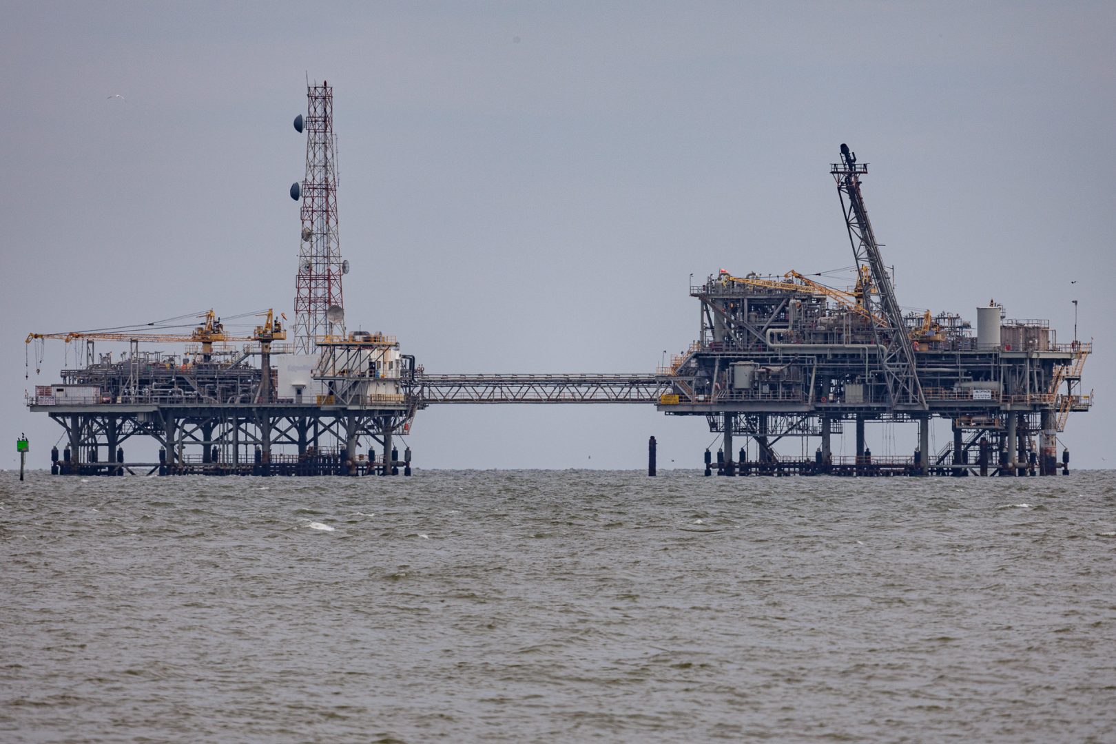 Des rochers qui la bordent, nous pouvons apercevoir une immense plate-forme de gaz offshore. Il y en a une soixantaine dans la baie.