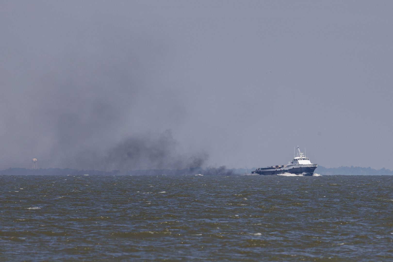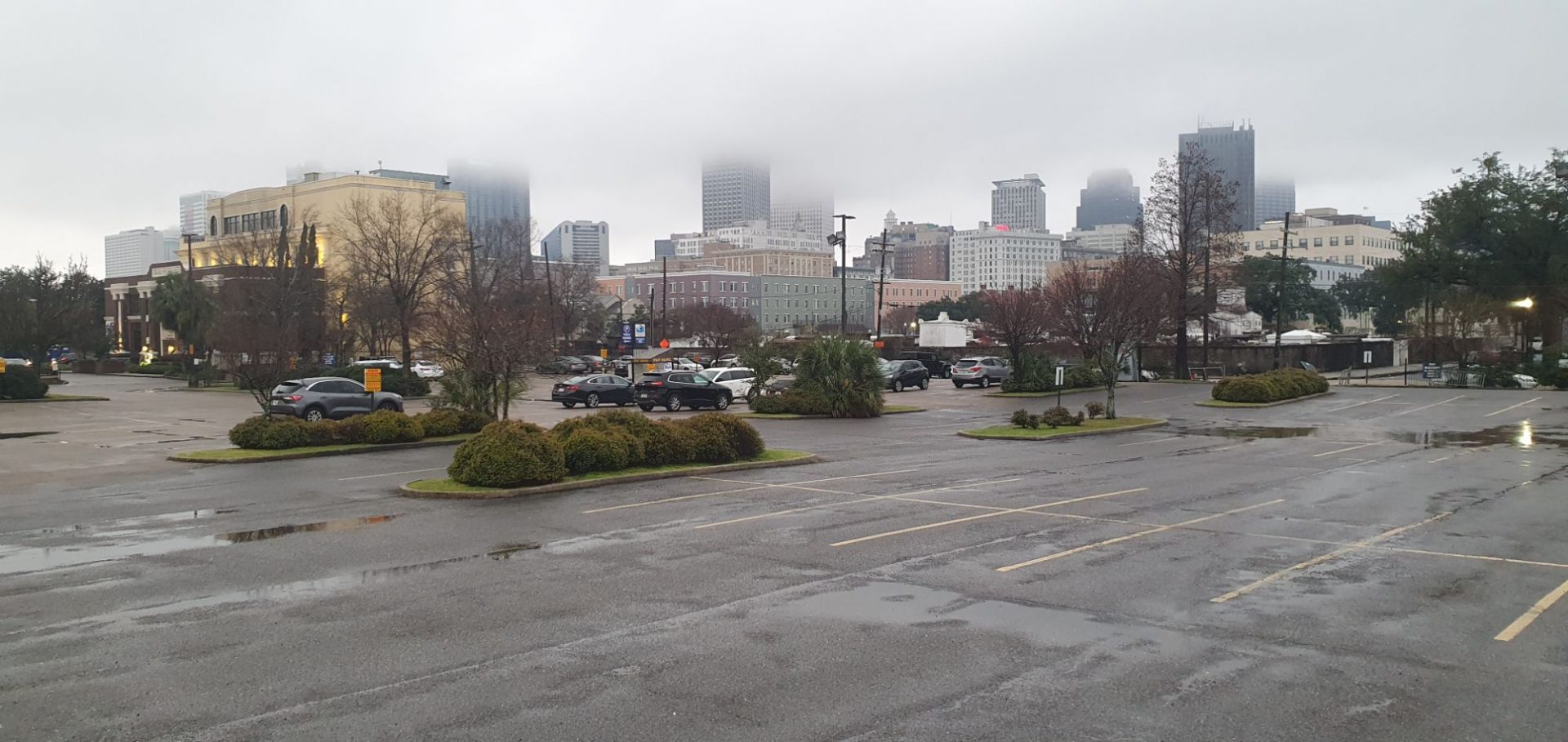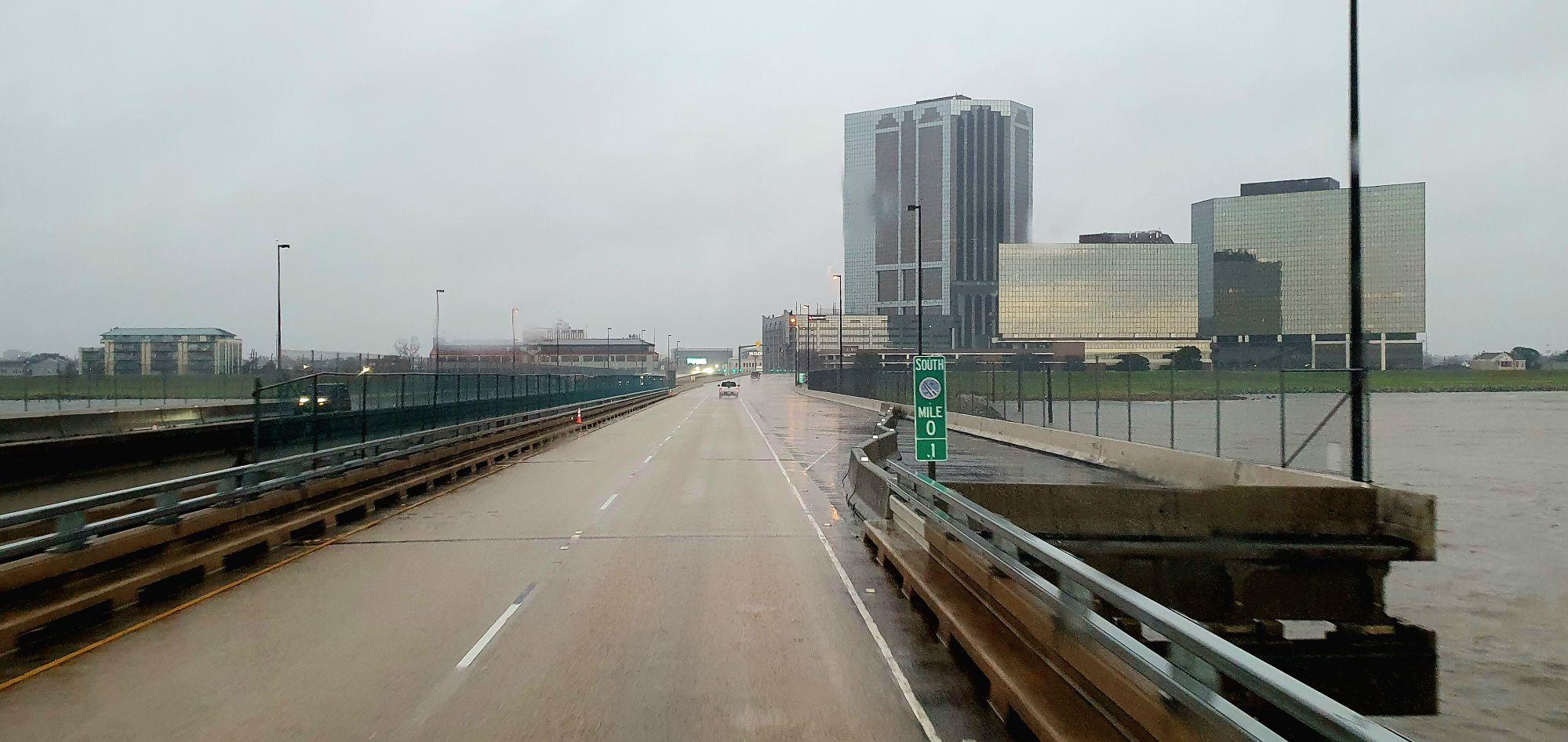 On aperçoit la Nouvelle-Orléans au loin dans la brume et la pluie.