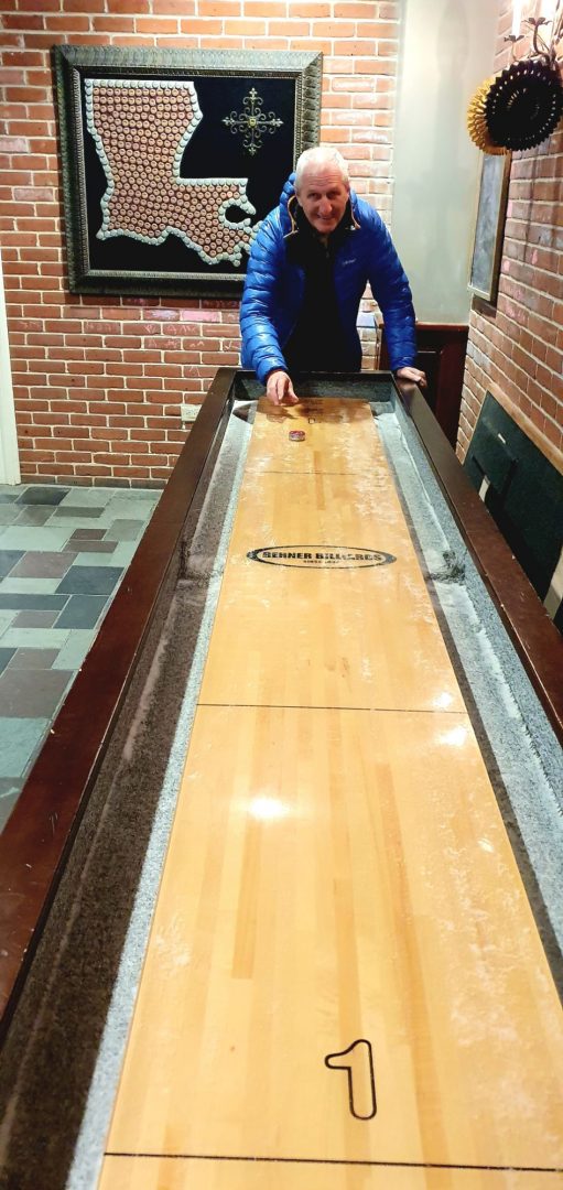 Nous en profitons pour découvrir ce jeu de palet. Il consiste à lancer ce petit palet avec suffisamment de force mais pas trop pour qu’il glisse le plus loin possible sans sortir ni sur les côtés ni au bout de la planche… Le sucre ou le sel (on n’a pas goûté 😳) déposé sur la planche contribue à la glisse. Cela devient vite énervant 🤪… mais c’est très amusant !