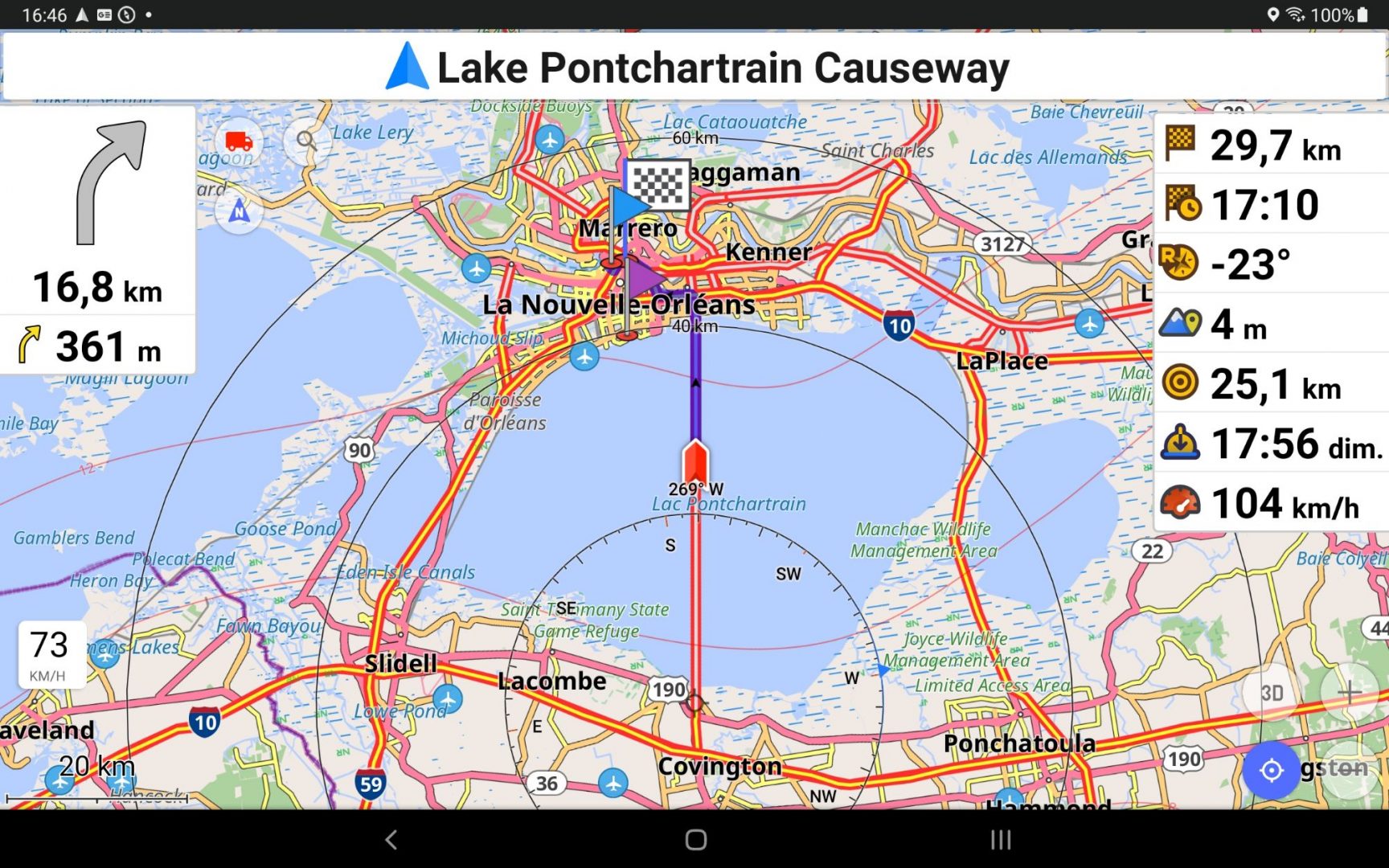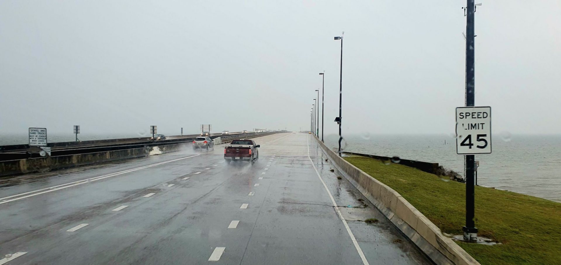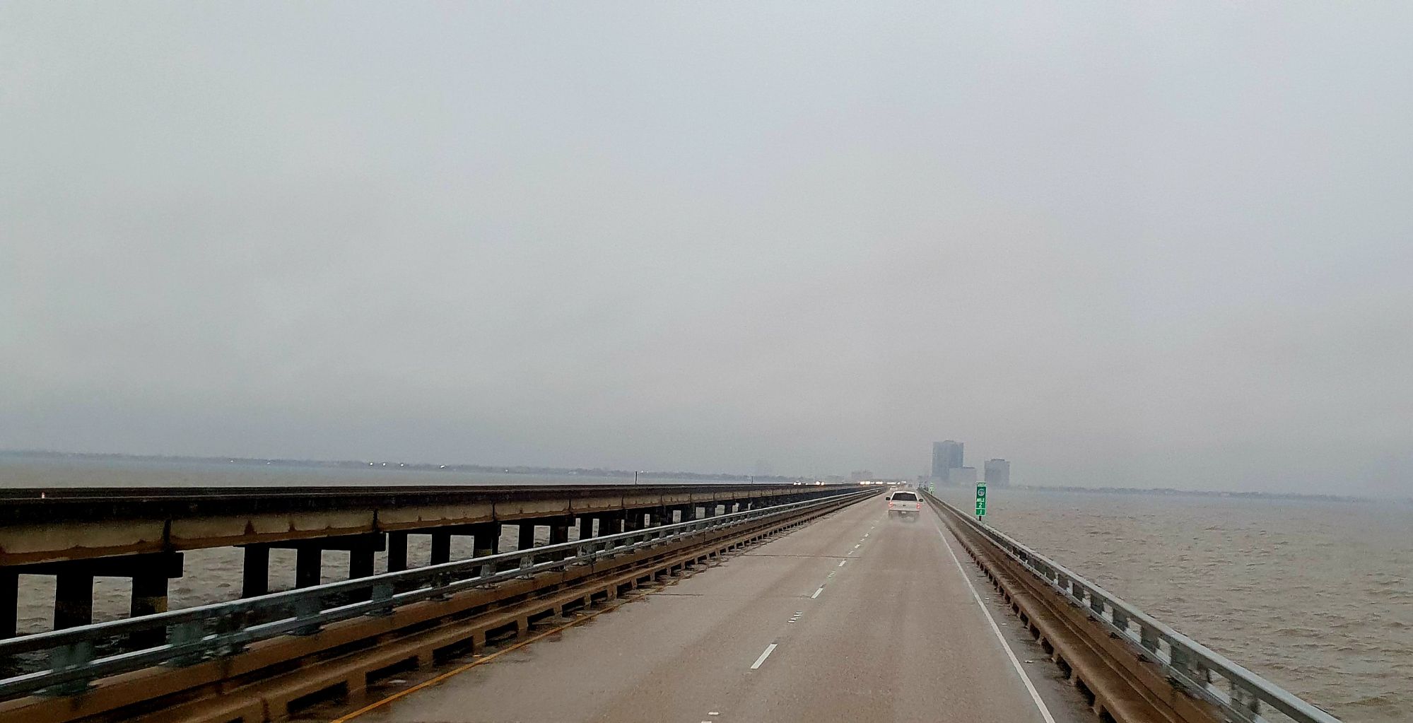 Nous empruntons la Lake Pontchartrain Causeway (chaussée du lac Pontchartrain). Il s’agit du troisième pont routier le plus long au monde avec une longueur de 38,42 km (23 miles). Les ponts sont soutenus par plus de 9 000 piles de béton.