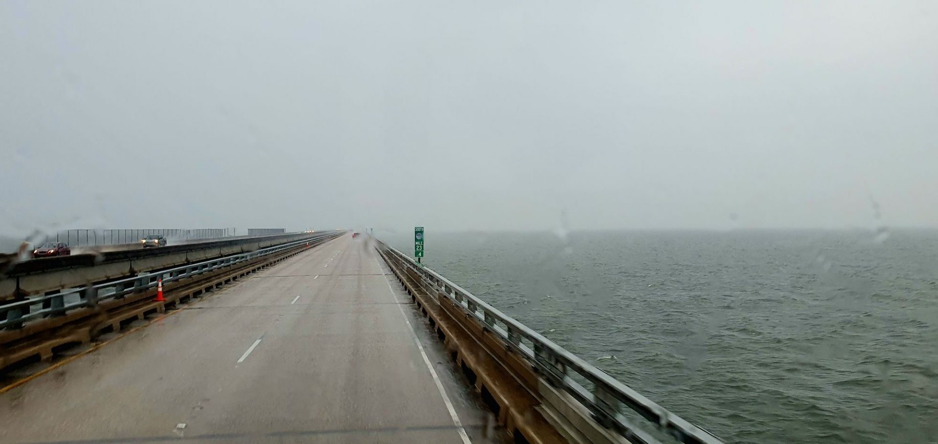 Il est situé en plein milieu du lac. Si on tombe à l’eau… il faut savoir nager 🤣🤣 ! Cela nous rappelle le pont que nous avions emprunté lors de notre retour de l’île du Prince Edouard au Canada… Mêmes conditions météos 😳