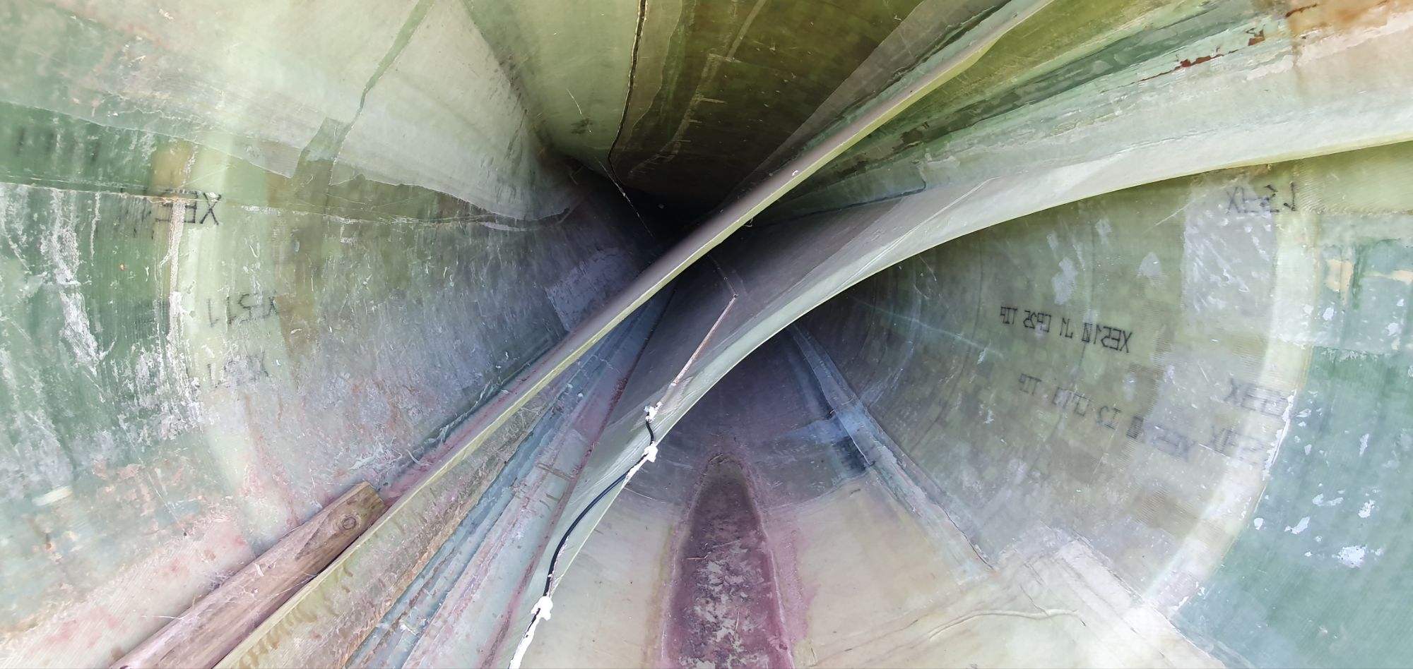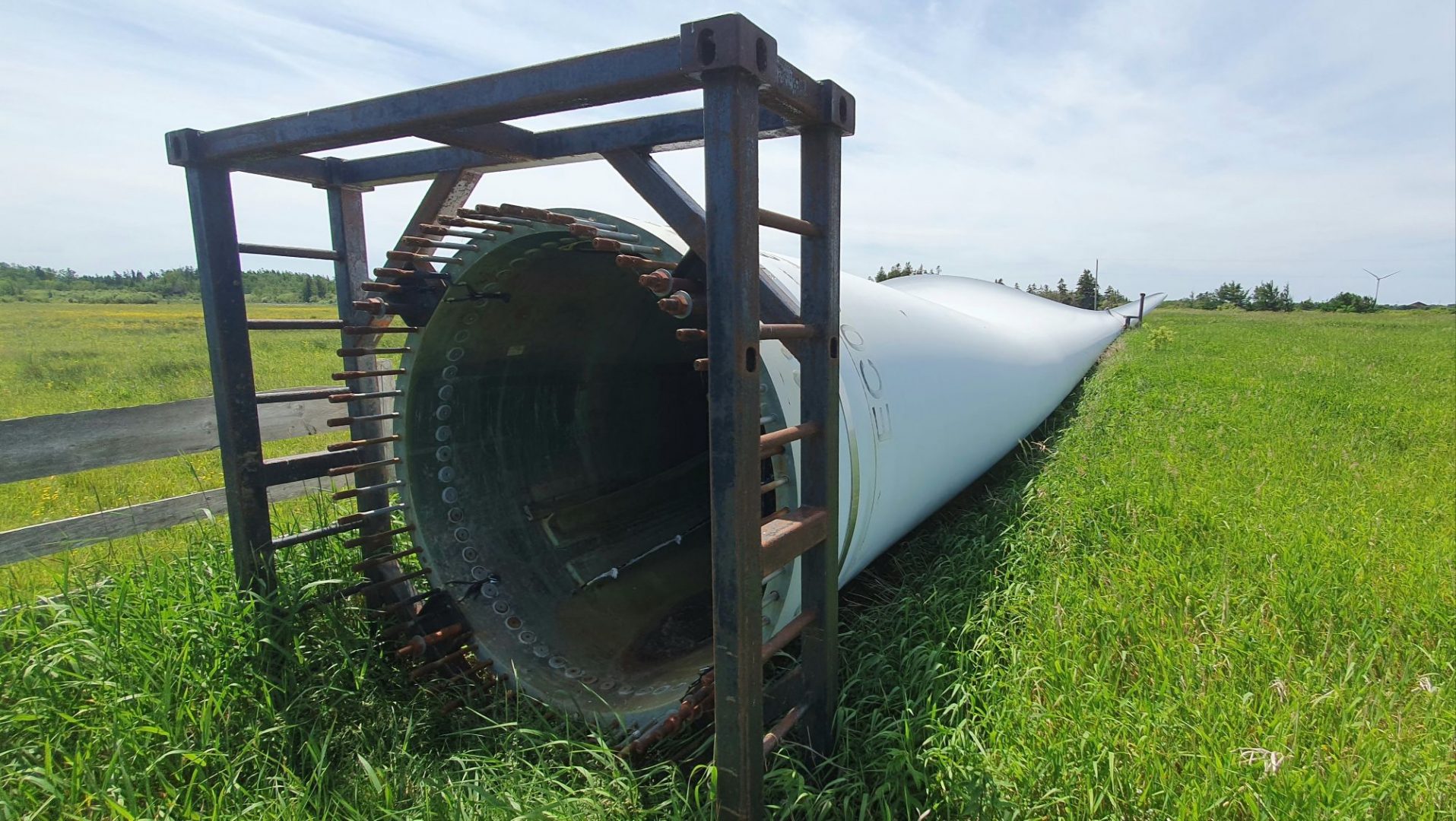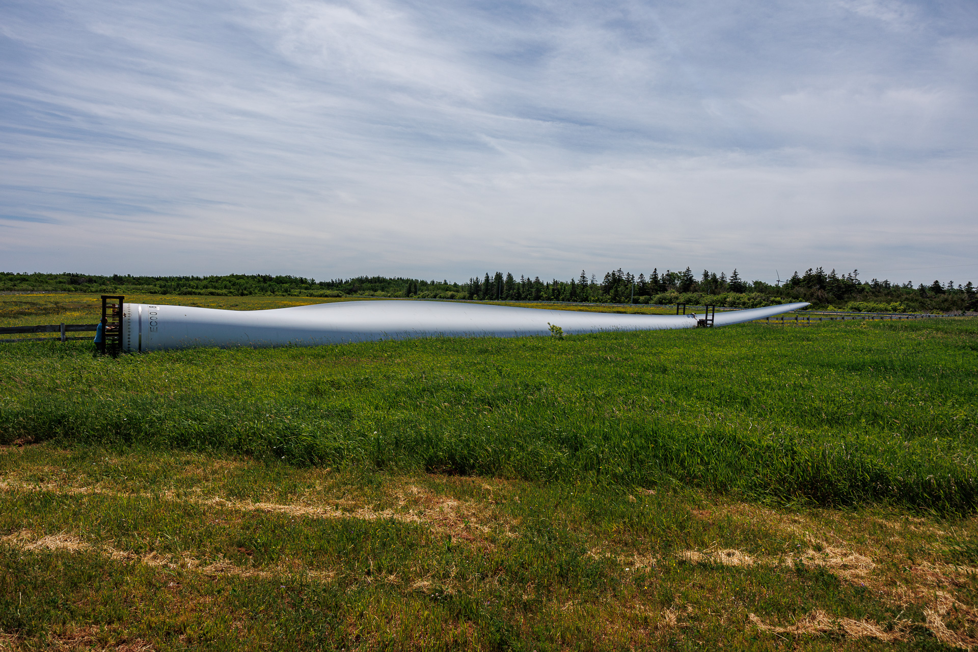 Une énorme pâle d’éolienne repose au sol. Nous allons la voir de plus près. Il s’agit sans doute d’une pâle qui a été changée.