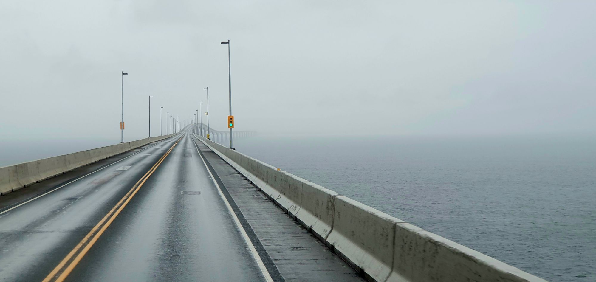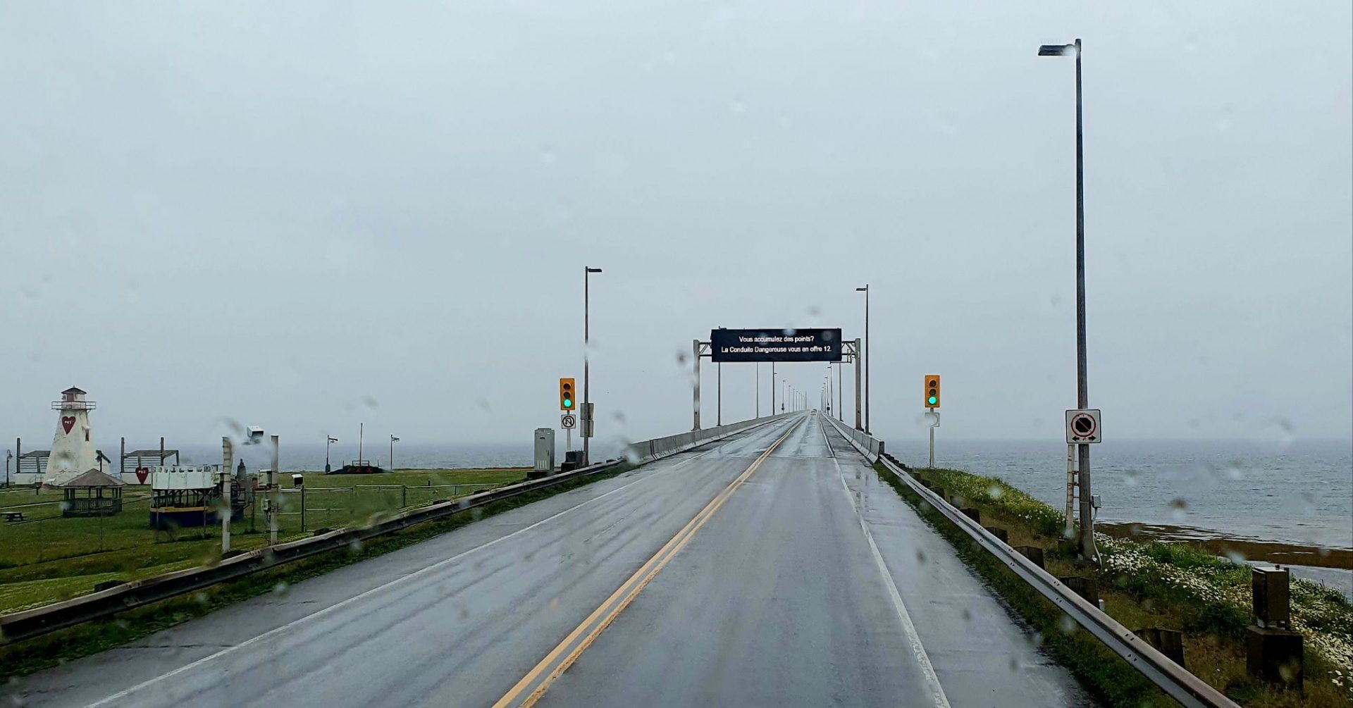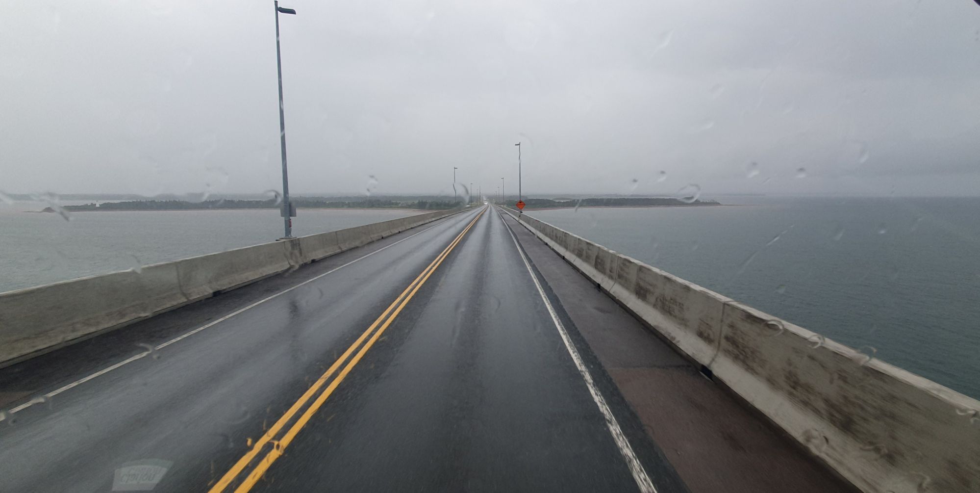 Après une traversée sous un fort vent de travers et beaucoup de pluie (vraiment pas très rassurant car le parapet n’est pas très haut 🥴), la terre ferme approche ! Une spécificité de l’accès à l’le-du-Prince-Edouard : seule la sortie est payante quel que soit votre mode de traversée (bateau ou route). Nous en avons eu pour 50 dollars canadiens soit 34 euros ce qui n’est pas très cher au regard de l’ouvrage.