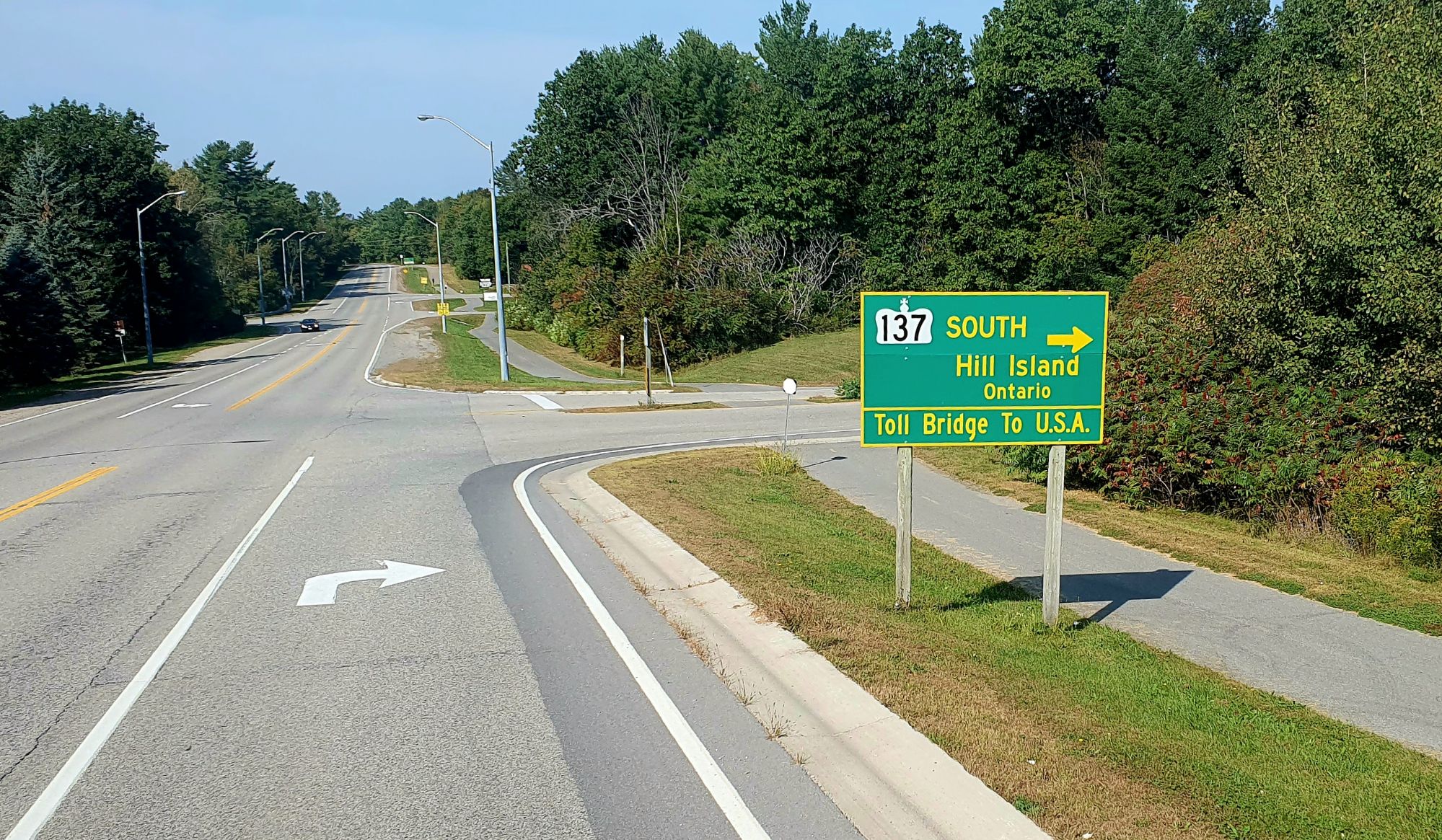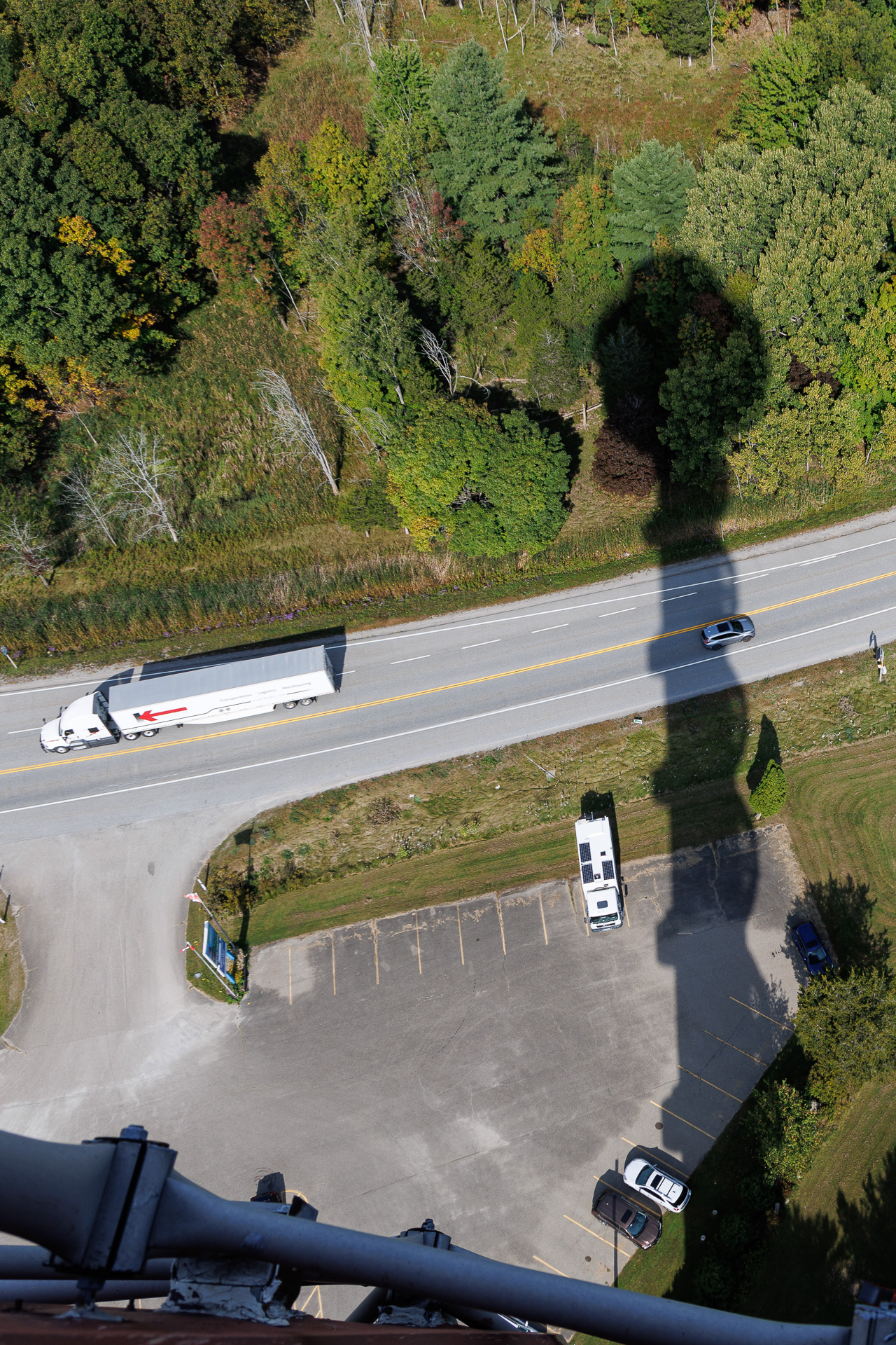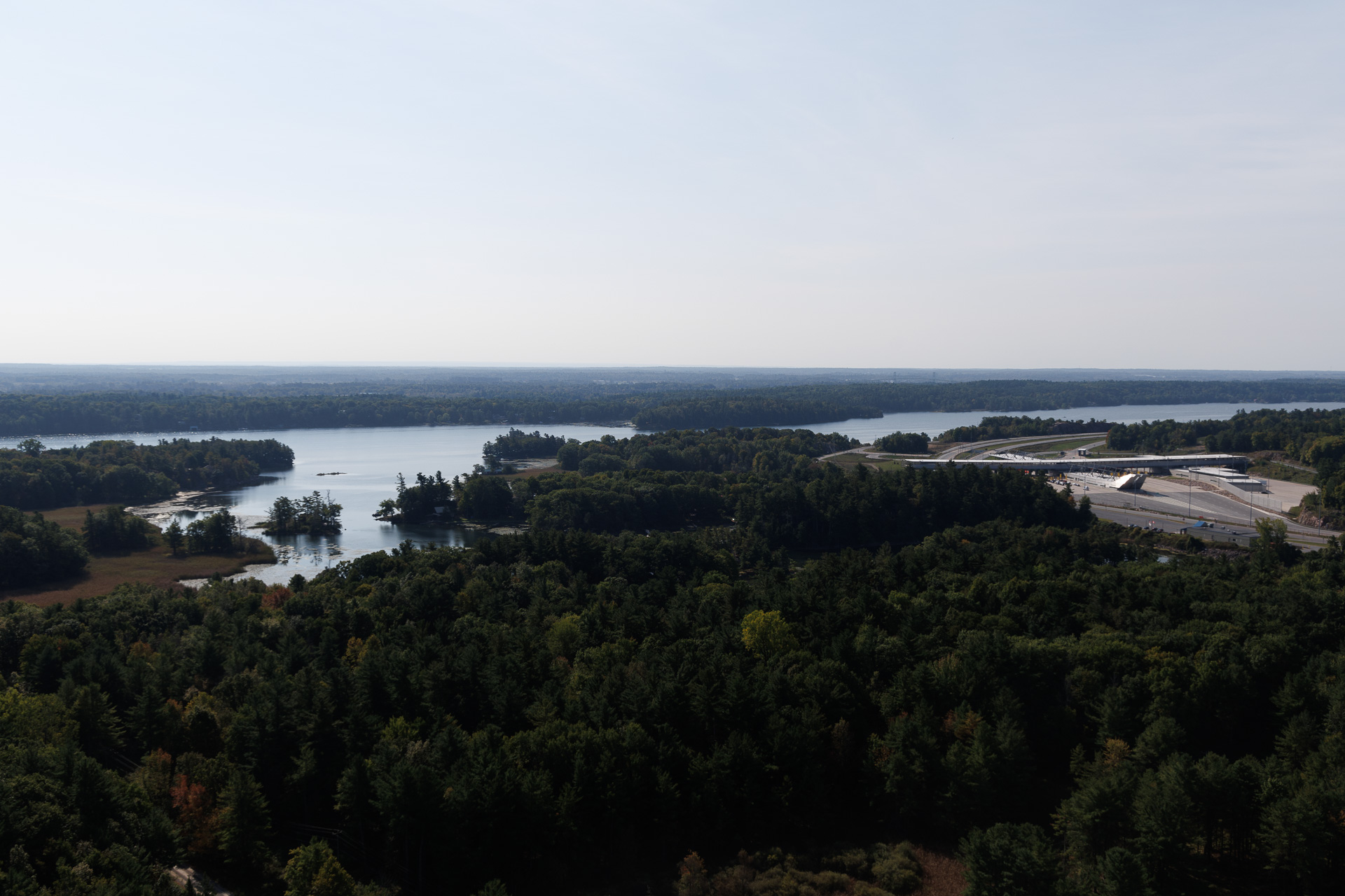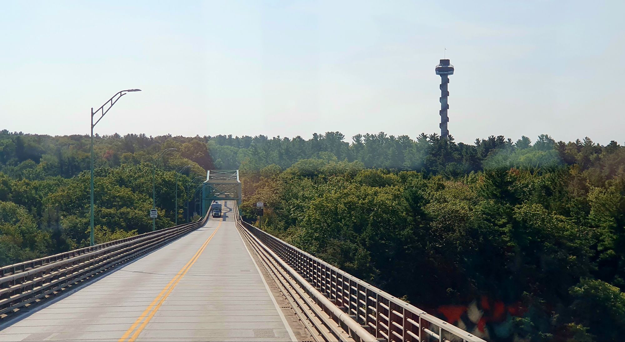 184972 km : Ce matin, nous quittons Rockport en direction de Kingston mais avant nous voulons visiter la tour d’observation qui domine les Milles-Îles. Au loin, nous apercevons le pont que nous allons emprunter et sous lequel nous sommes passés en bateau hier.