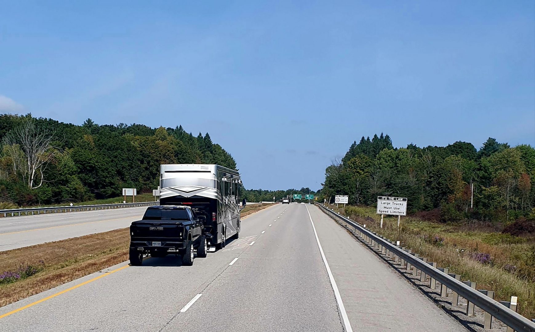 Sur la route qui nous mène à Kingston, nous sommes doublés par 2 véhicules qui se suivent de très près… oups, non un seul, un long bus camping-car 3 essieux qui tracte un gros pick-up ! Sur les petites routes, cela doit être sportif de conduire un tel convoi ! Il y a sans doute aussi une moto ou un quad à l’intérieur 😉