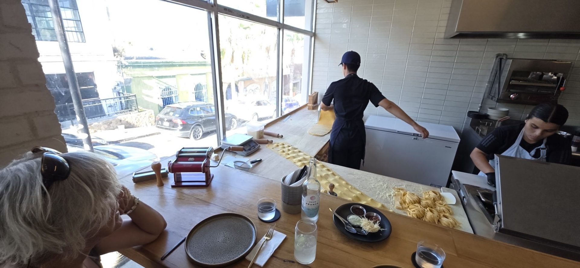 Pour le déjeuner, nous trouvons un restaurant italien extrêmement sympathique, complet (c’est bon signe 😉), noté 4.9 sur Google avec plus de 1000 avis : Come a casa. Nous déjeunerons donc au comptoir, face aux pastiers, ce qui nous permettra de découvrir tout un tas de techniques de fabrication 🙂.