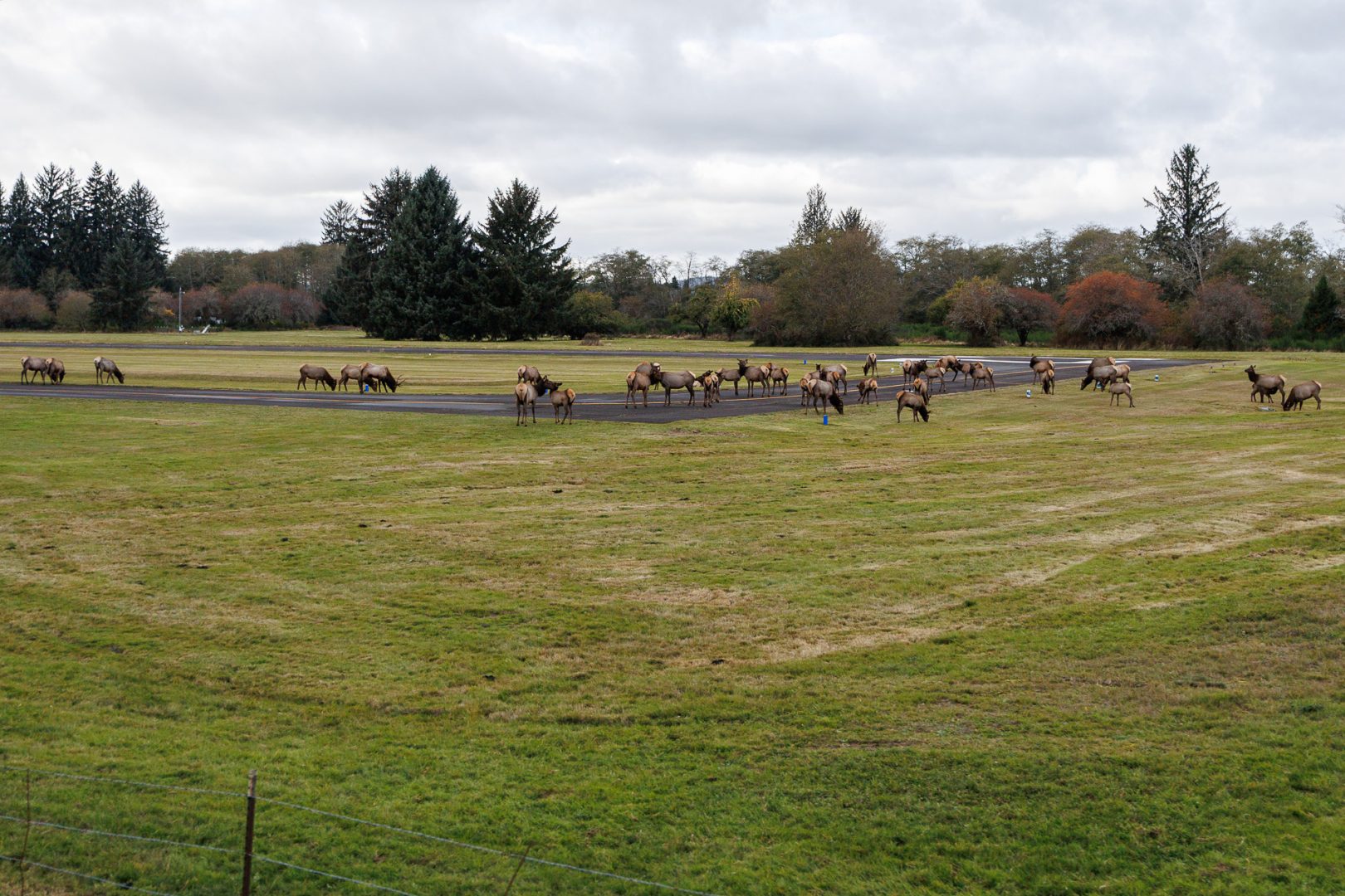 Sur la route, nous sommes attirés par un troupeau impressionnant de wapitis qui déambulent tranquillement sur un aérodrome. Le nombre d’animaux nous semble si inhabituel que l’on se demande s’il ne s’agit pas d’un élevage 🤔. D’habitude, on les croise par 3 ou 4…