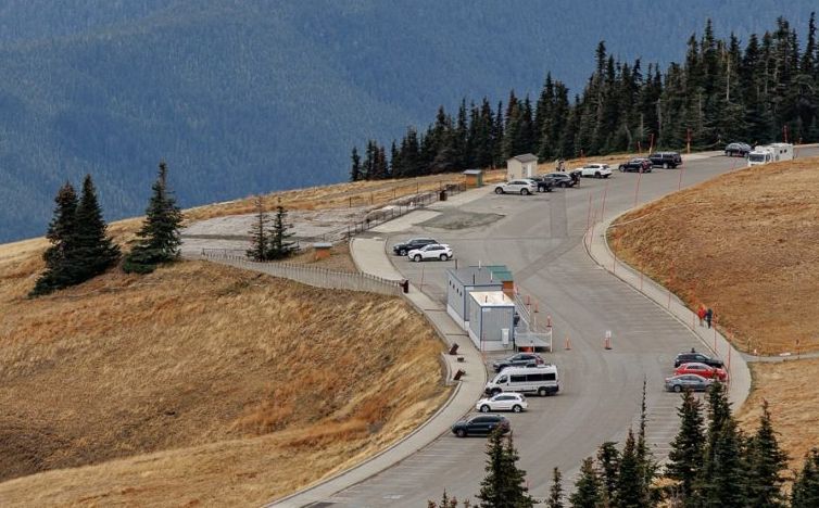 Nous passons devant l’ancien centre d’accueil. Le 7 mai 2023, le Hurricane Ridge Day Lodge construit en 1952 et le centre d’accueil des visiteurs ont été détruits par un incendie. En mai 2025, un projet de 80 millions de dollars pour reconstruire le Day Lodge a été lancé. Les travaux ont été suspendus en raison des coupes budgétaires de l’administration fédérale. Un bâtiment temporaire fait office de centre des visiteurs et des toilettes mobiles ont été installées en attendant que les crédits soient débloqués.