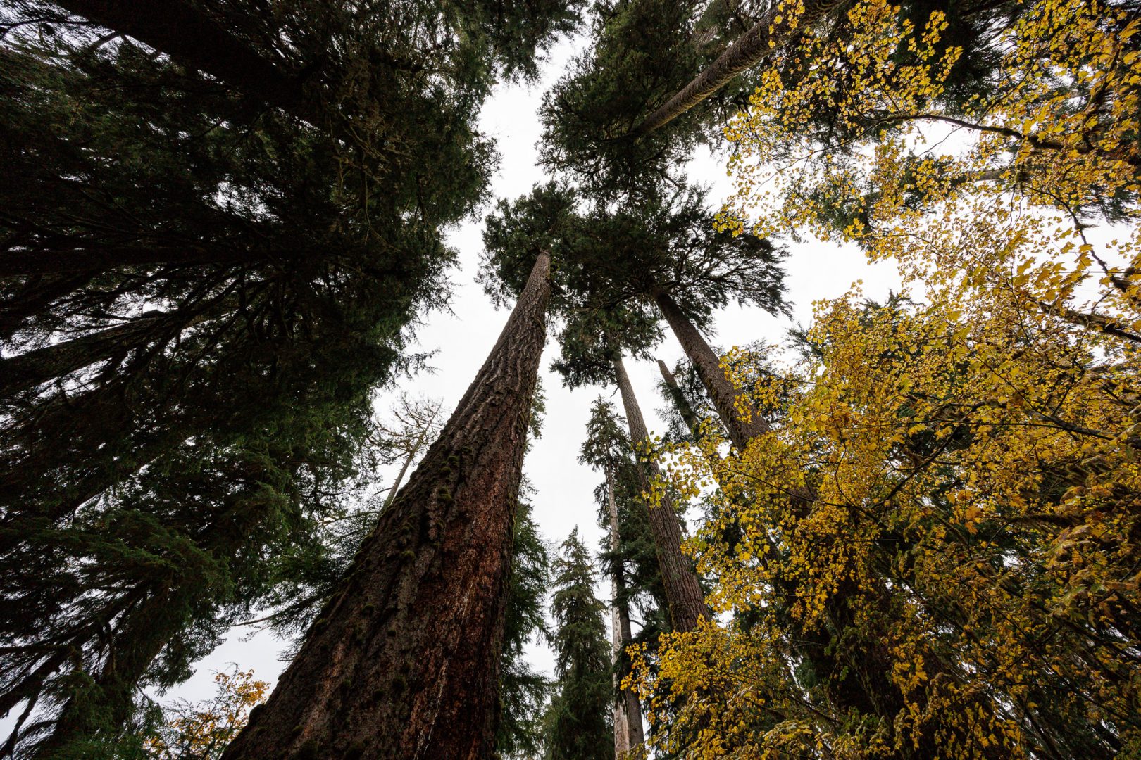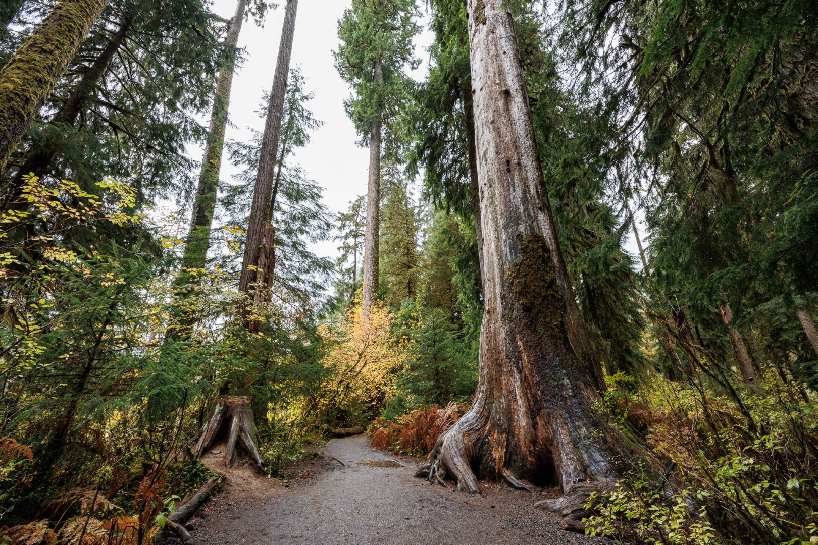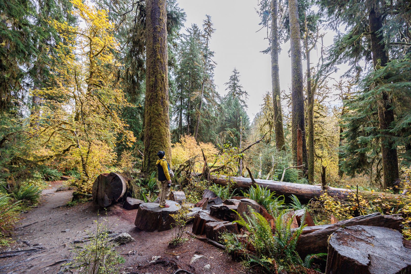 Les espèces dominantes dans cette forêt sont,  entre autres, les sapins de Douglas, les cèdres rouges, les érables à grandes feuilles, les aulnes rouges. Certains de ces géants d’Amérique du Nord peuvent atteindre une taille énorme (plus de 90 m de haut et 7 m de diamètre). Marc paraît déjà tout petit sur un spécimen ordinaire 🤣 !
