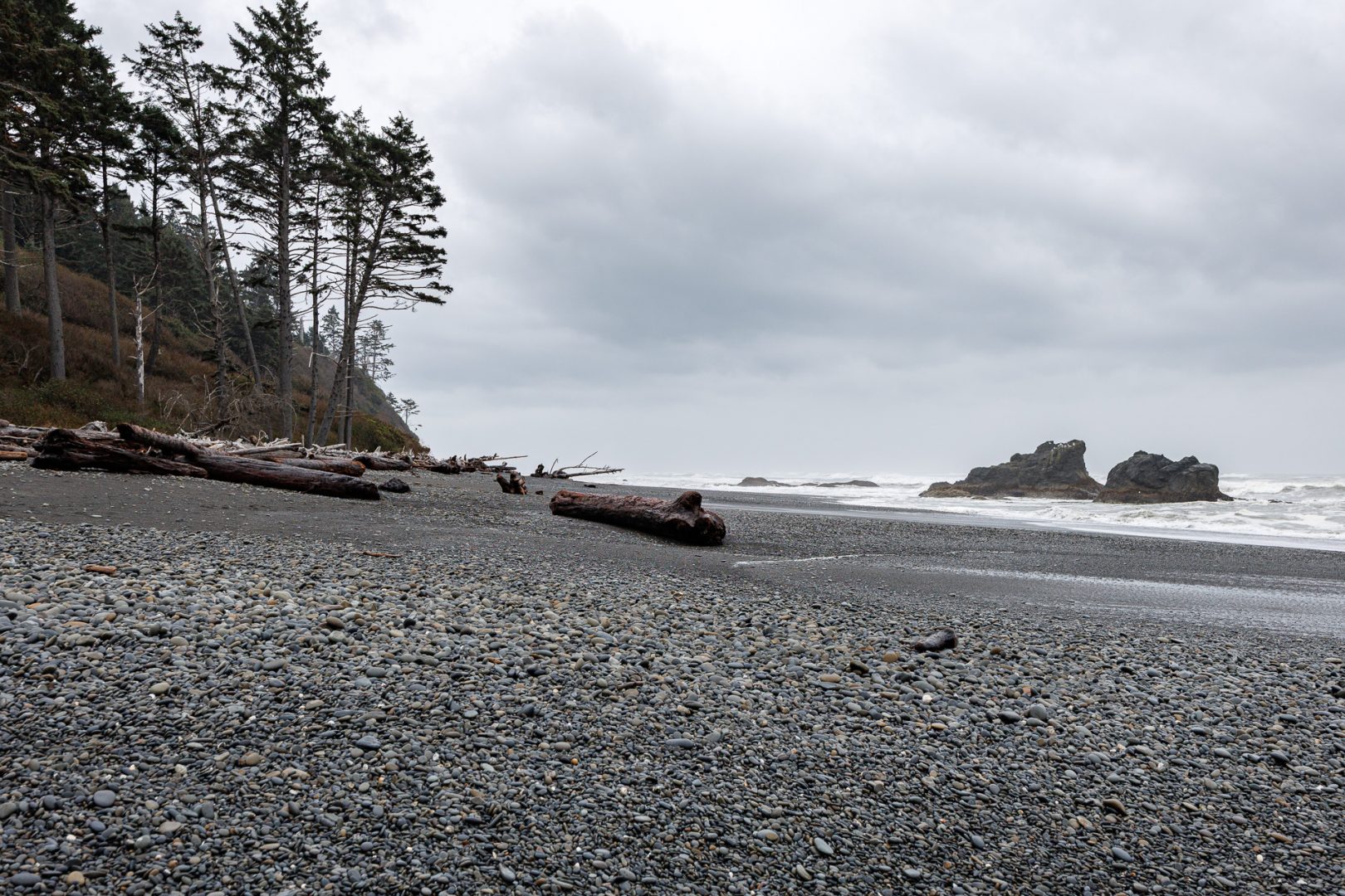 Le nom de Ruby Beach vient des minéraux rouges présents dans le sable. Ces minéraux sont connus sous le nom d’« almandite », un type de grenat. Elle est réputée aussi pour son bois flotté abondant, ses couchers de soleil époustouflants et ses côtes sauvages et rocheuses. Pas de soleil, un temps couvert et gris… Nous ne pouvons pas admirer la couleur rouge du sable mais nous pouvons admirer sa beauté sauvage, et son bois flotté 🤩 qui constitue une belle barrière pour accéder à la plage…