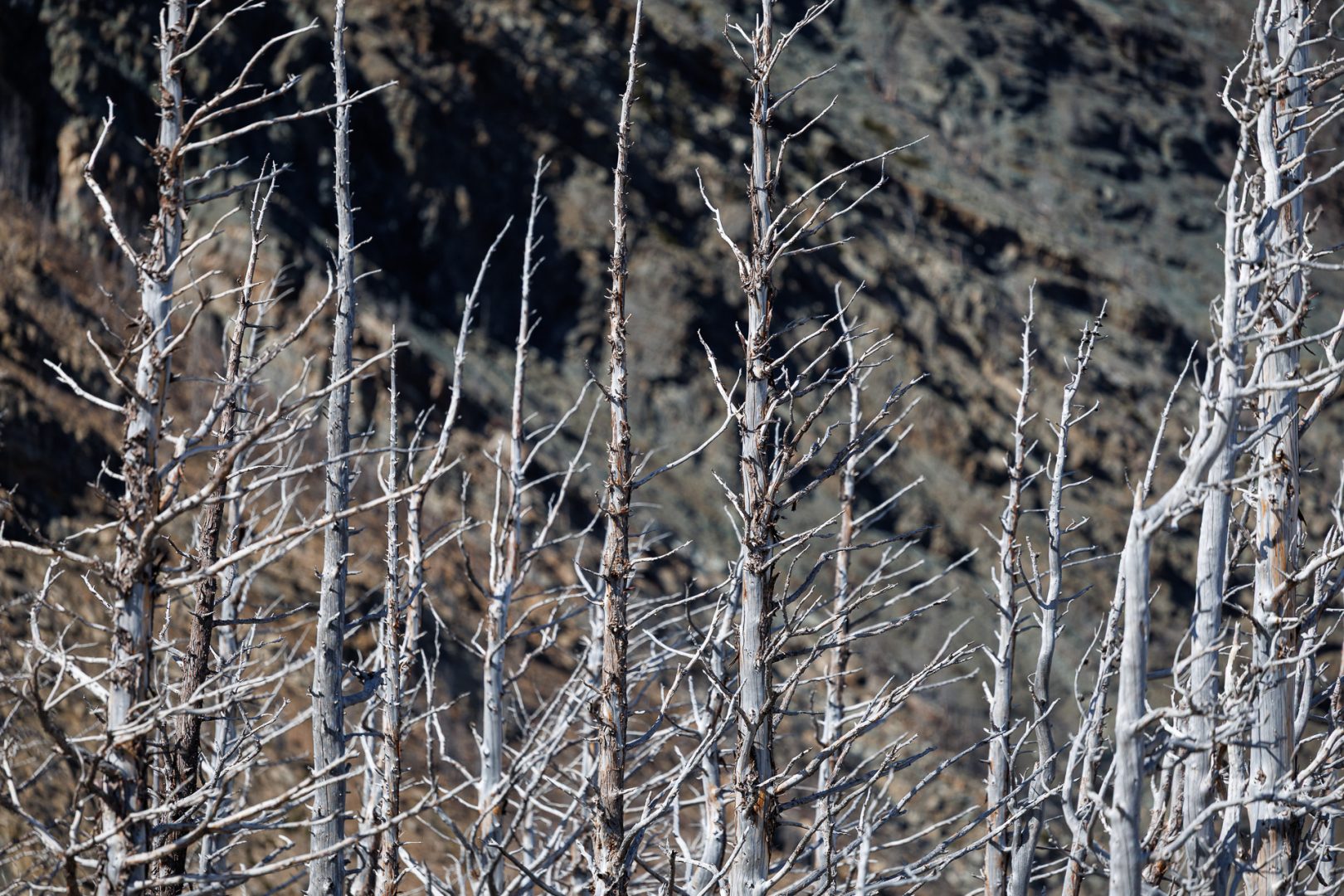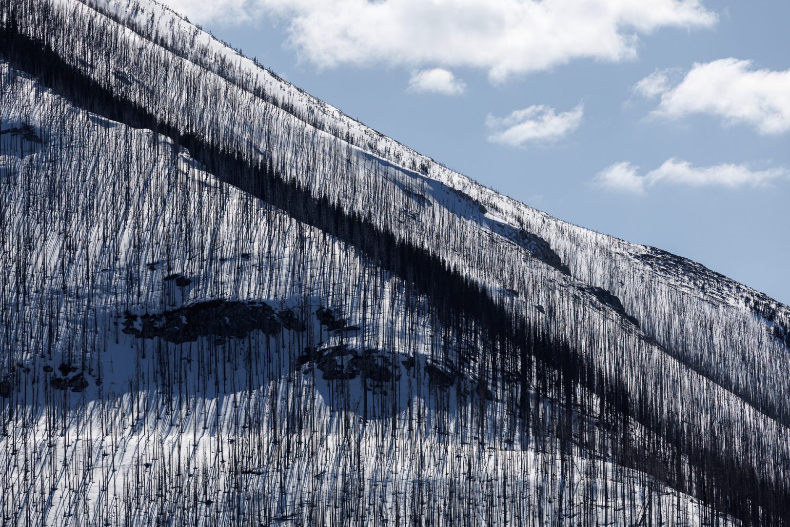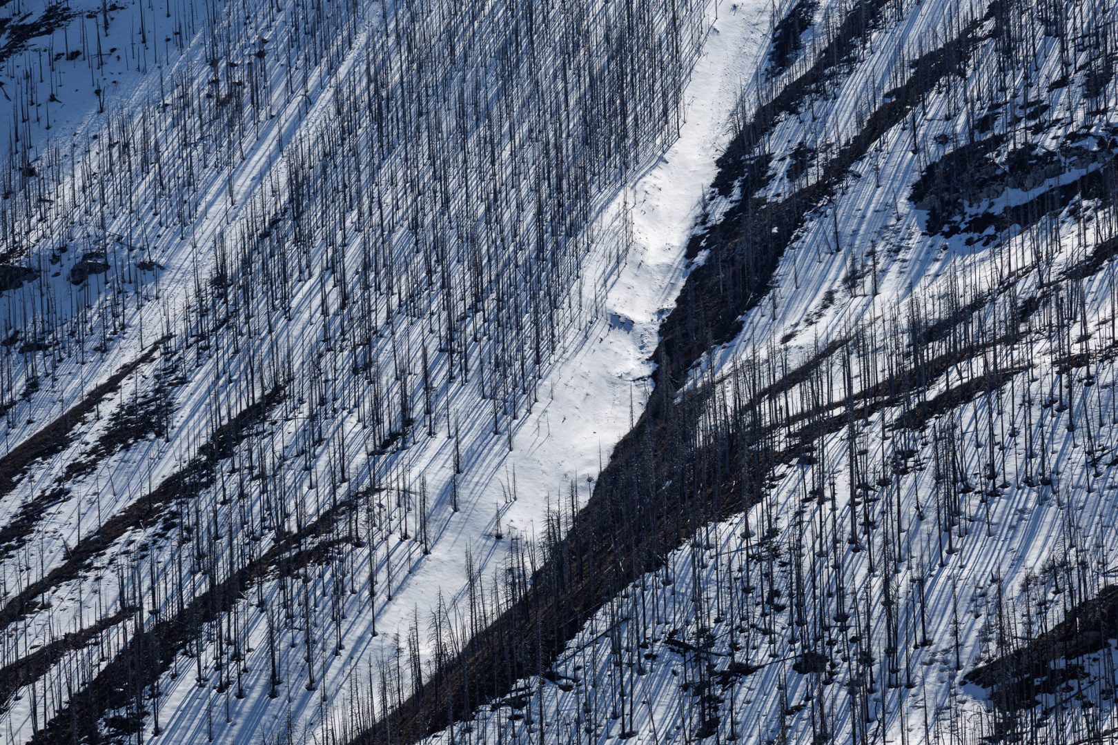 Les arbres morts ressemblent à des milliers de mikados plantés dans la neige !
