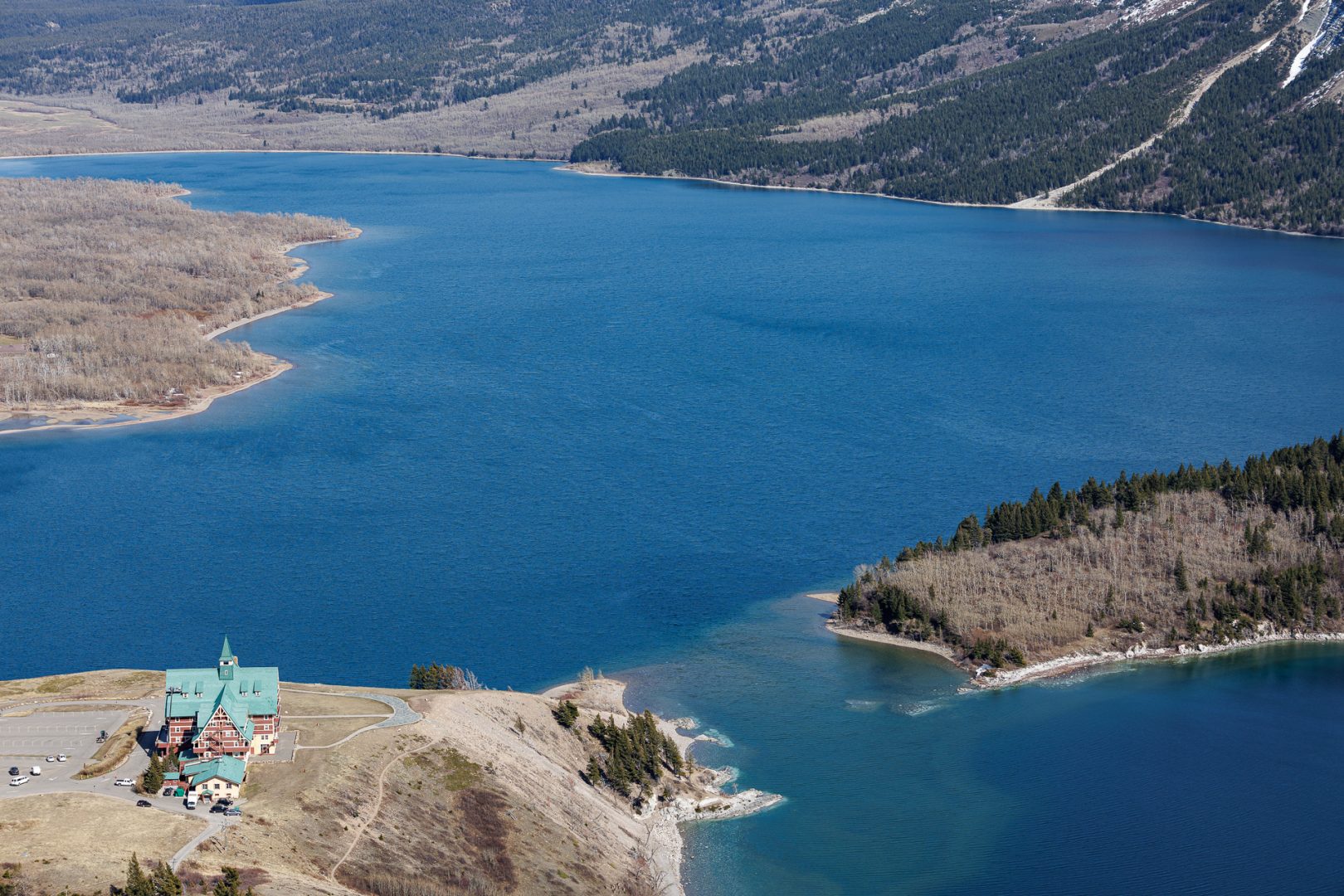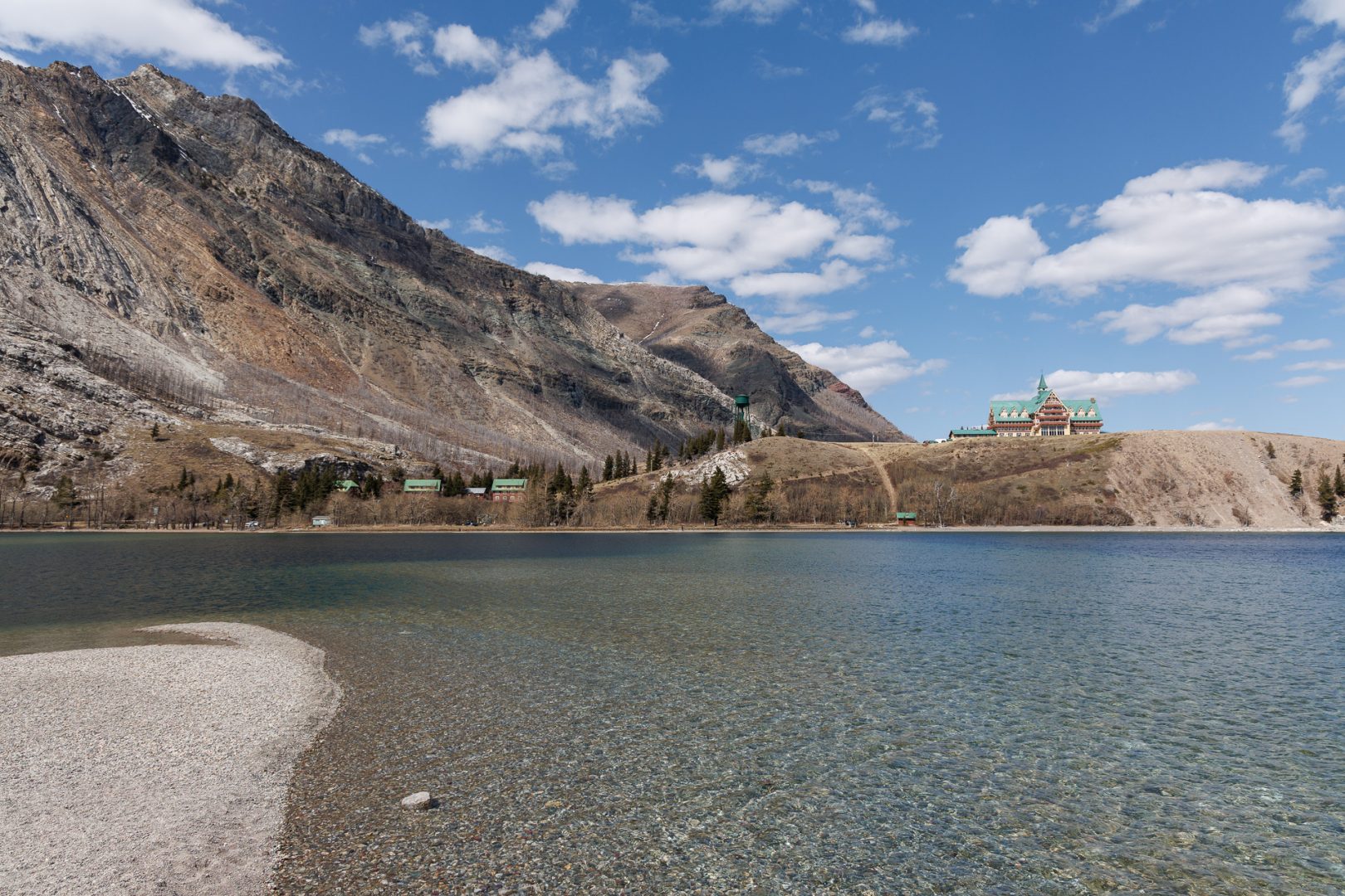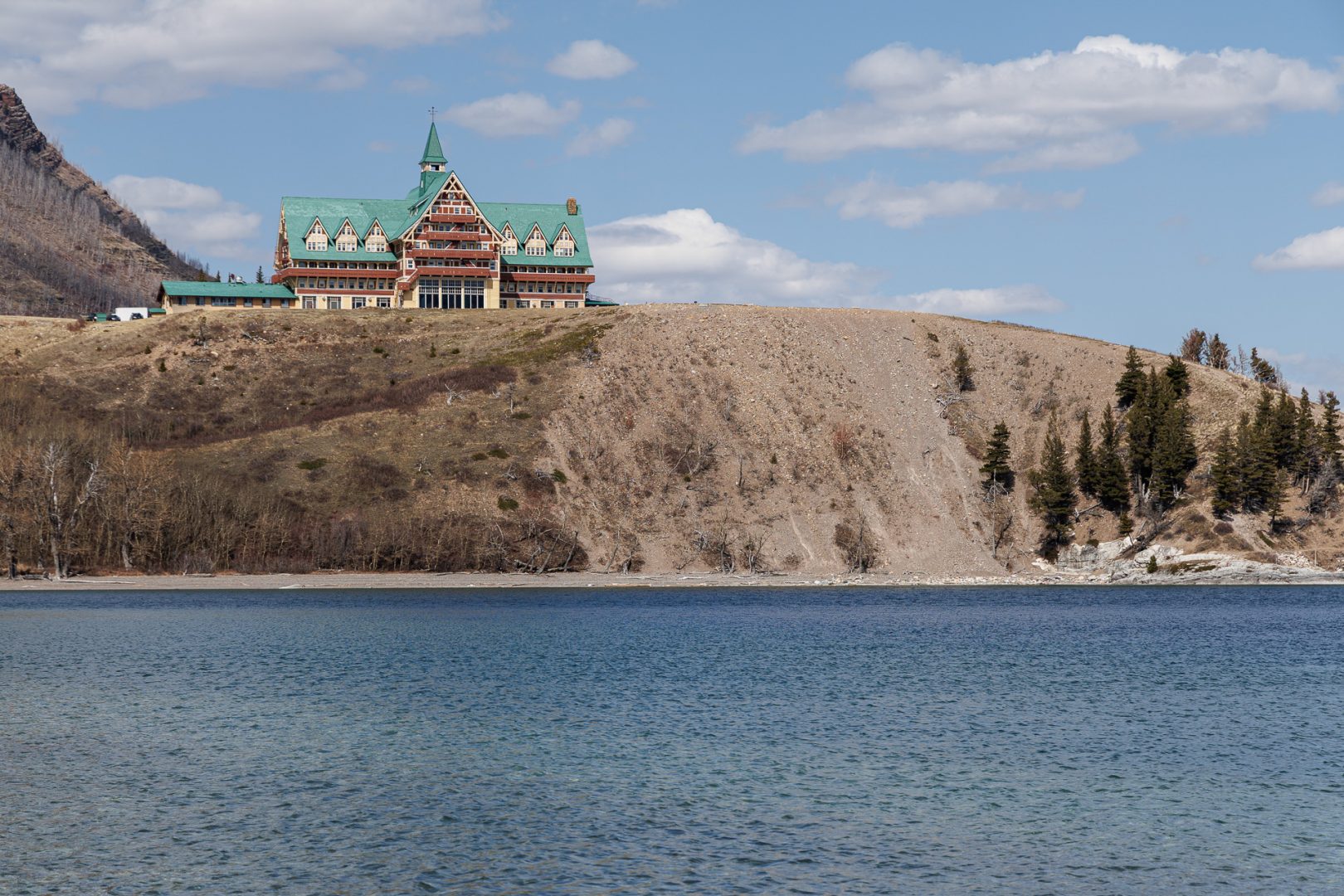 En 1911, le président de la Great Northern Railway, James Hill, eut pour vision de faire du parc des Lacs-Waterton et Glacier le «terrain de jeu du Nord-Ouest». Il entreprit alors de construire des infrastructures (hôtels, routes, chalets et sentiers) pour développer le tourisme dans le parc. Sur la colline en face, on aperçoit l’hôtel Prince of Wales construit en 1927 par la Canadian Rockies Hotel Co. Ltd, une filiale de la Great Northern Railway. L’hôtel constitue l’un des grands survivants des hôtels de villégiature développés par les réseaux ferroviaires du Canada et des États-Unis. Il a été reconnu comme lieu historique national en 1995.