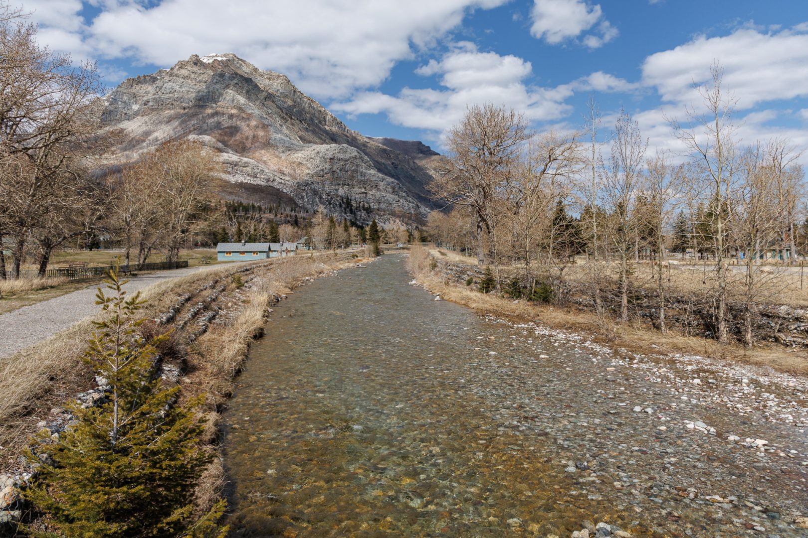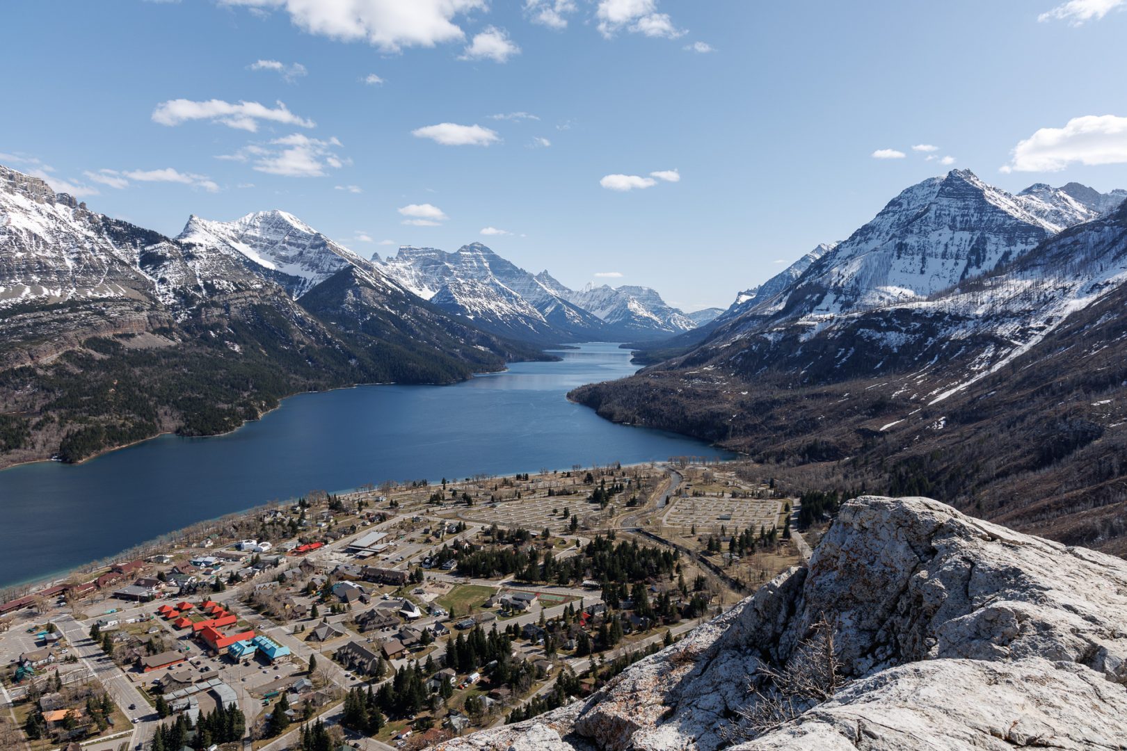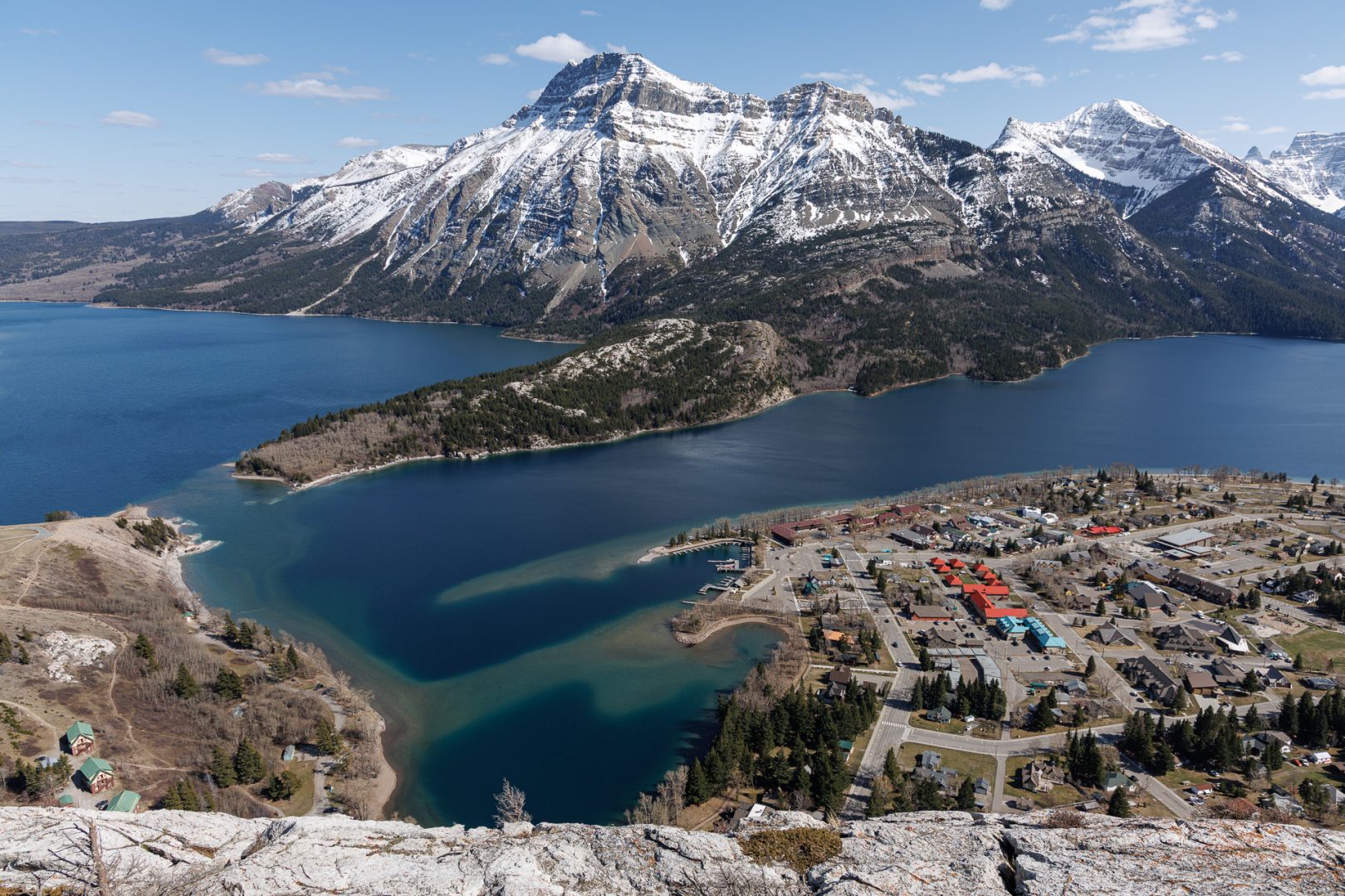 En 1911, le président de la Great Northern Railway, James Hill, eut pour vision de faire du parc des Lacs-Waterton et Glacier le «terrain de jeu du Nord-Ouest». Il entreprit alors de construire des infrastructures (hôtels, routes, chalets et sentiers) pour développer le tourisme dans le parc. Sur la colline en face, on aperçoit l’hôtel Prince of Wales construit en 1927 par la Canadian Rockies Hotel Co. Ltd, une filiale de la Great Northern Railway. L’hôtel constitue l’un des grands survivants des hôtels de villégiature développés par les réseaux ferroviaires du Canada et des États-Unis. Il a été reconnu comme lieu historique national en 1995.