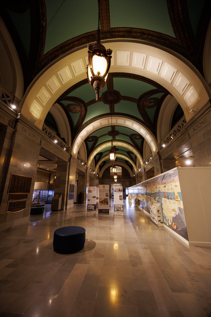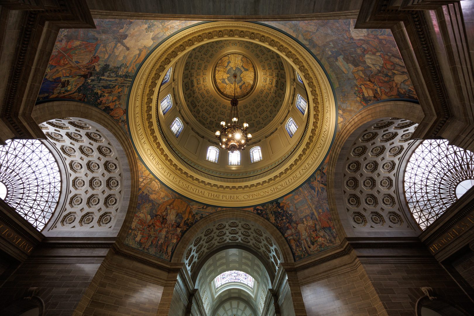 Le Capitole actuel est le troisième à dominer Jefferson City 😉. Le premier fut construit en 1826 lors du transfert du siège du gouvernement dans la ville. Les flammes ont ravagé ce bâtiment en 1837. Un nouveau bâtiment de style néogothique fut construit vers 1880 mais il a également brûlé en 1911, lors de l’un des incendies les plus spectaculaires de l’histoire du Missouri. Les architectes new-yorkais Egerton Swartwout et Evarts Tracy furent choisis pour concevoir le nouveau bâtiment. Le 3ème Capitole fut inauguré le 6 octobre 1924.
