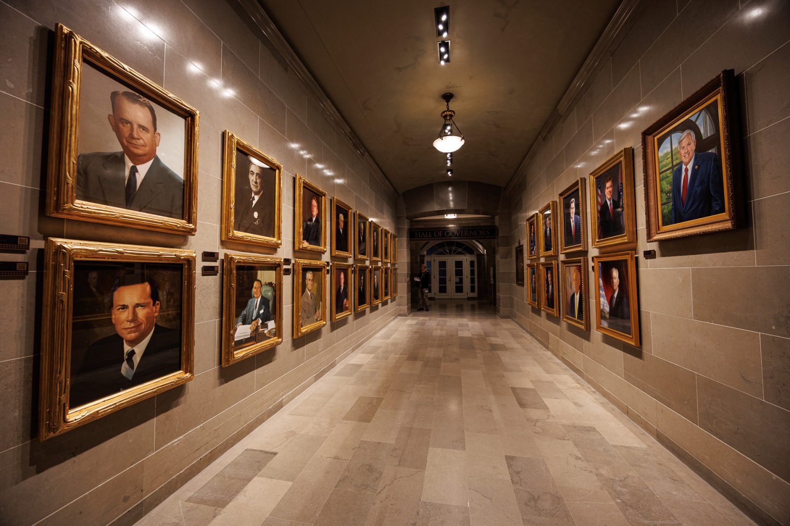 Nous voilà dans le « couloir des Gouverneurs ». Il y a en tout 2 couloirs.  Le dernier gouverneur, en poste jusqu’en 2024, figure sur le mur de droite. En novembre 2024, un nouveau gouverneur a été élu pour 4 ans. Une place l’attend sous son predécesseur 😊
